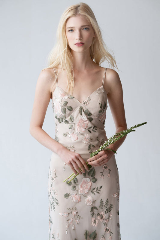 Once you’ve selected your desired length, style, and colour, you can let yourself get a little bit playful with texture and details. Sleeves come in all lengths and styles like flutter, cap, long, sheer, and off-the-shoulder. Some brides choose to add an extra flourish like sequins or florals to their maid of honour’s dress so that it stands out.