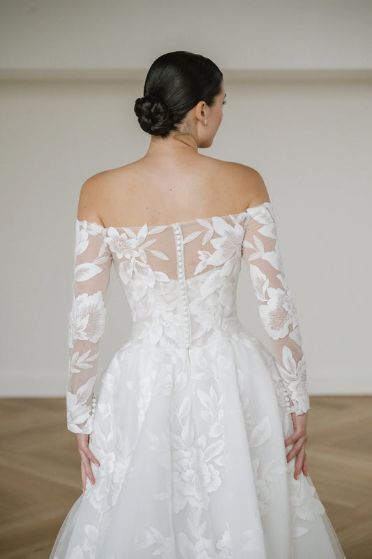 We always recommend looking to the past and seeing what has stuck around through the years. Check out your favourite designers, celebrities, and brands to see what they’ve been designing, wearing, and selling, as well as who they are inspired by. Things like cathedral veils, a-line gowns, and fabric buttoned bodices are good examples of timeless wedding dress styles, but you’ll find that there are a lot of options that stand the test of time. Look at necklines (hint: the sweetheart neckline is the most popular through time), silhouettes, sleeves, and trains to find something you love that won’t go out of style.