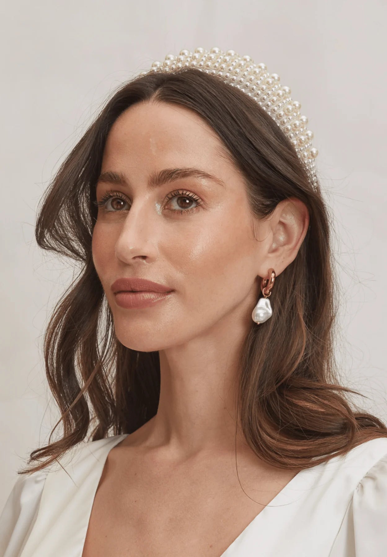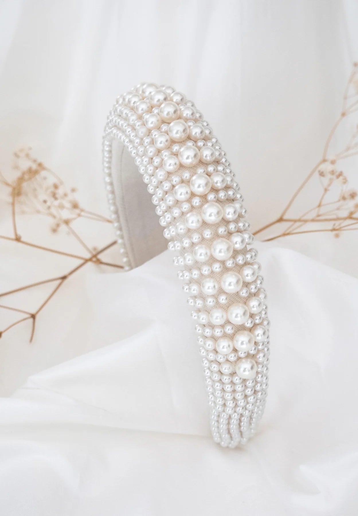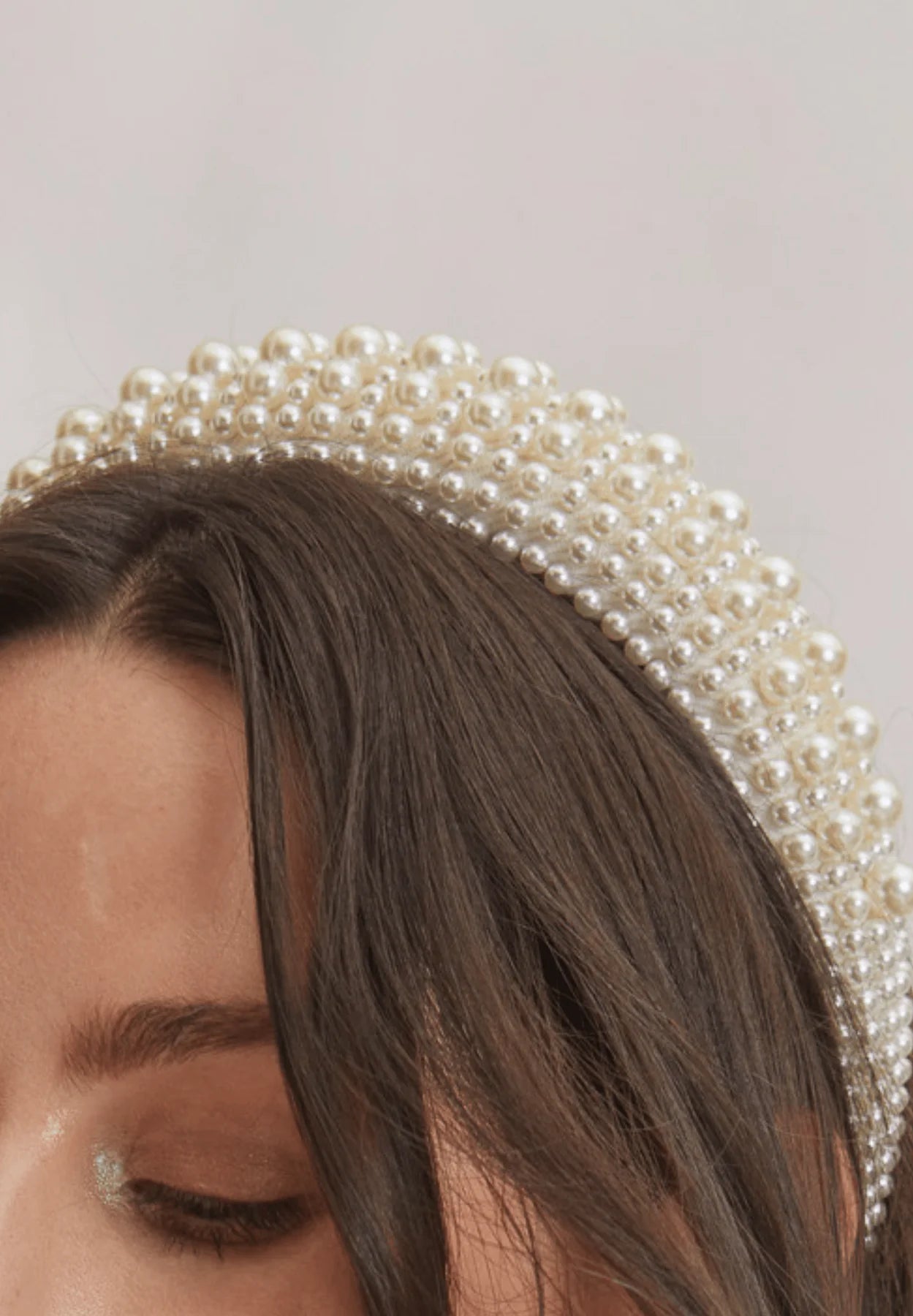 Elevate your style with the distinctive Alta headband, offering a pearlescent allure through its meticulously arranged rows of pearls on a luxurious puffy silk base. This elegant accessory seamlessly blends sophistication and charm, making a captivating fashion statement.