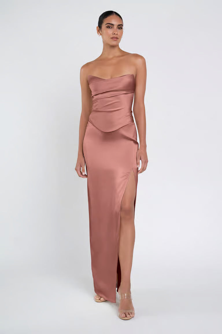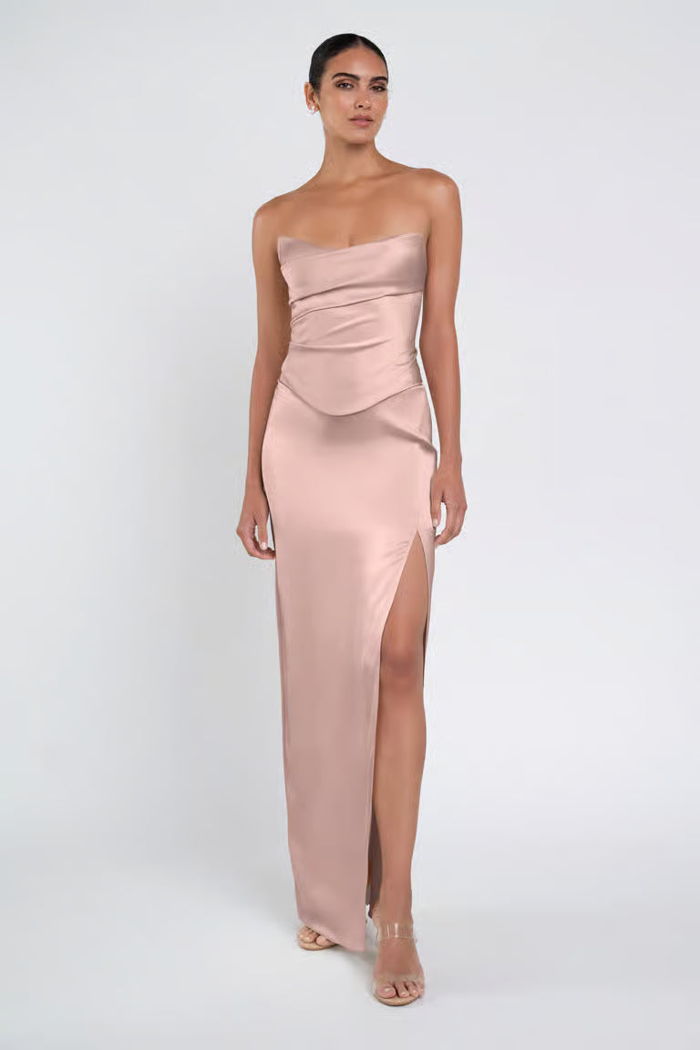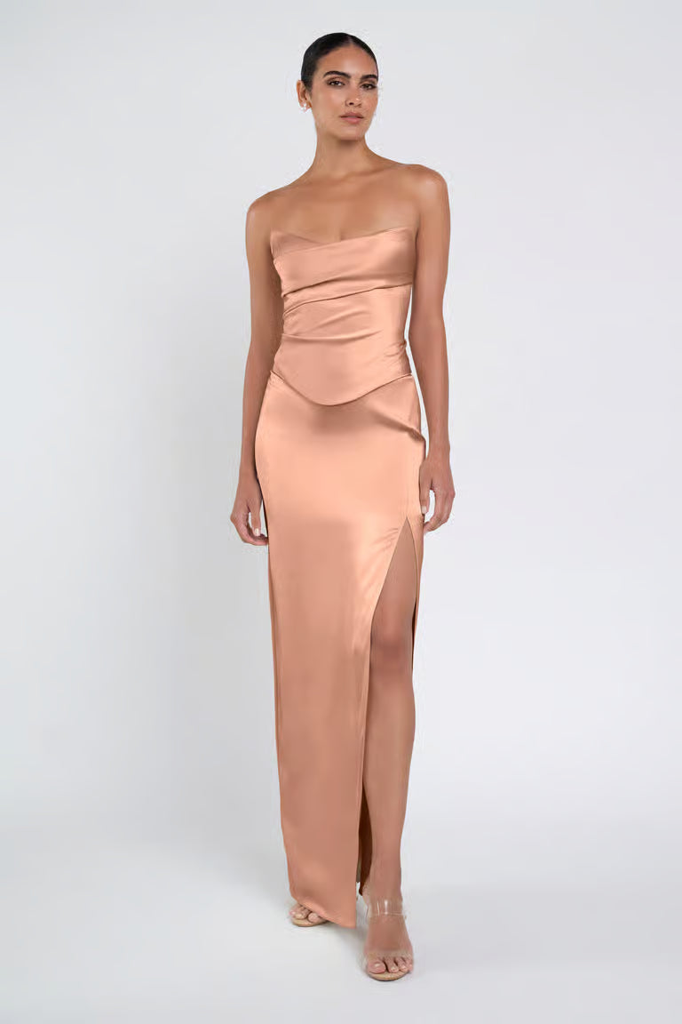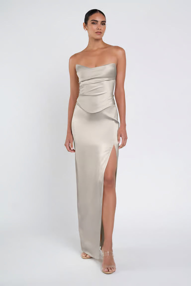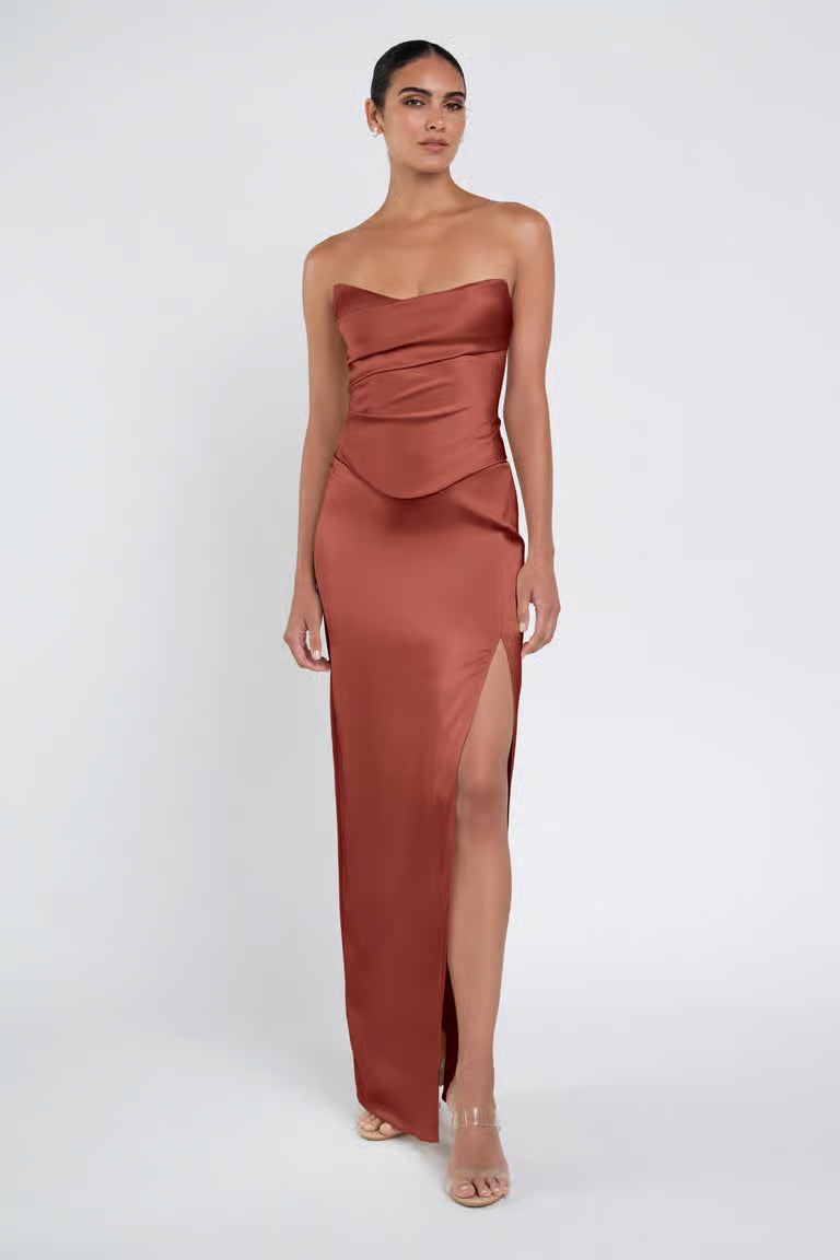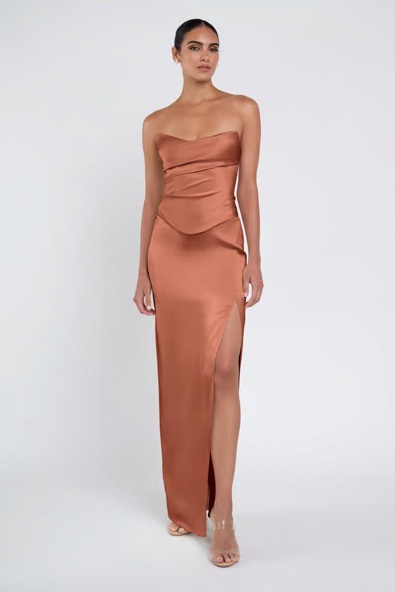 The luxurious satin Amaya dress creates the illusion of a separate corset bodice paired with a sleek, slim skirt, featuring a sultry side slit for added allure.