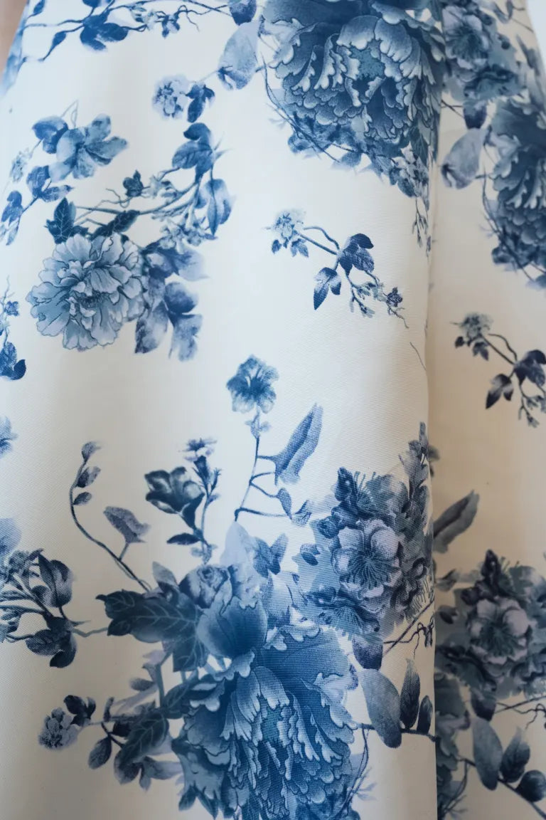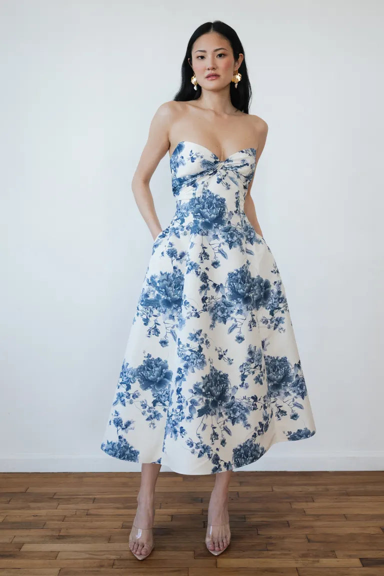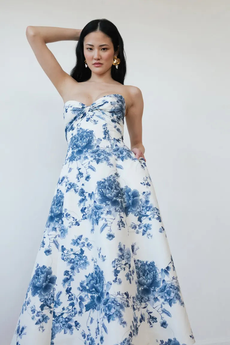 The Amelia dress, featuring a charming flower design, seems like it could have blossomed straight from a garden in France. Its strapless top with a heart-shaped neckline and gently lowered waistline create a lovely shape, while the flowing skirt adds a touch of elegance.