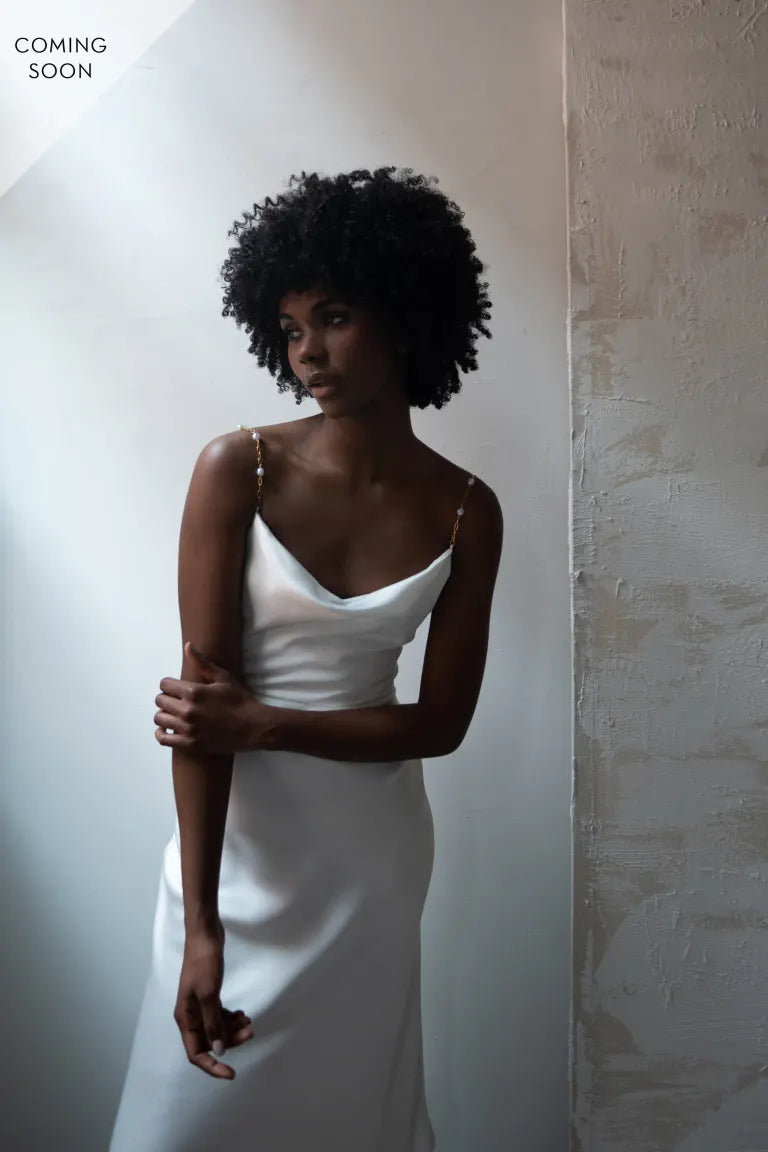 Step into timeless elegance with the Andrea satin midi dress, a chic classic with a modern update. This stunning satin dress features gold chain straps dotted with pearls, elevating it to new heights of sophistication.