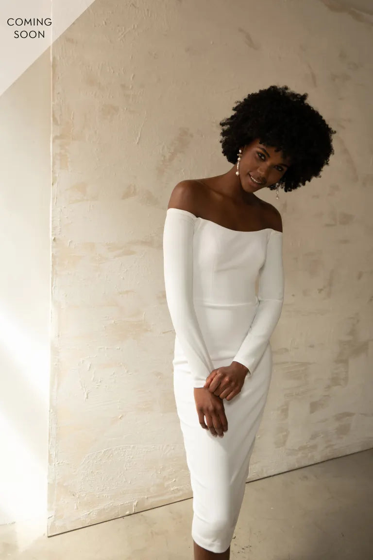 Experience the epitome of bridal elegance with the Ayla dress. This stunning piece showcases a dramatic off the shoulder neckline and slim fitted long sleeves, making it a chic and sleek choice for all your bridal events.