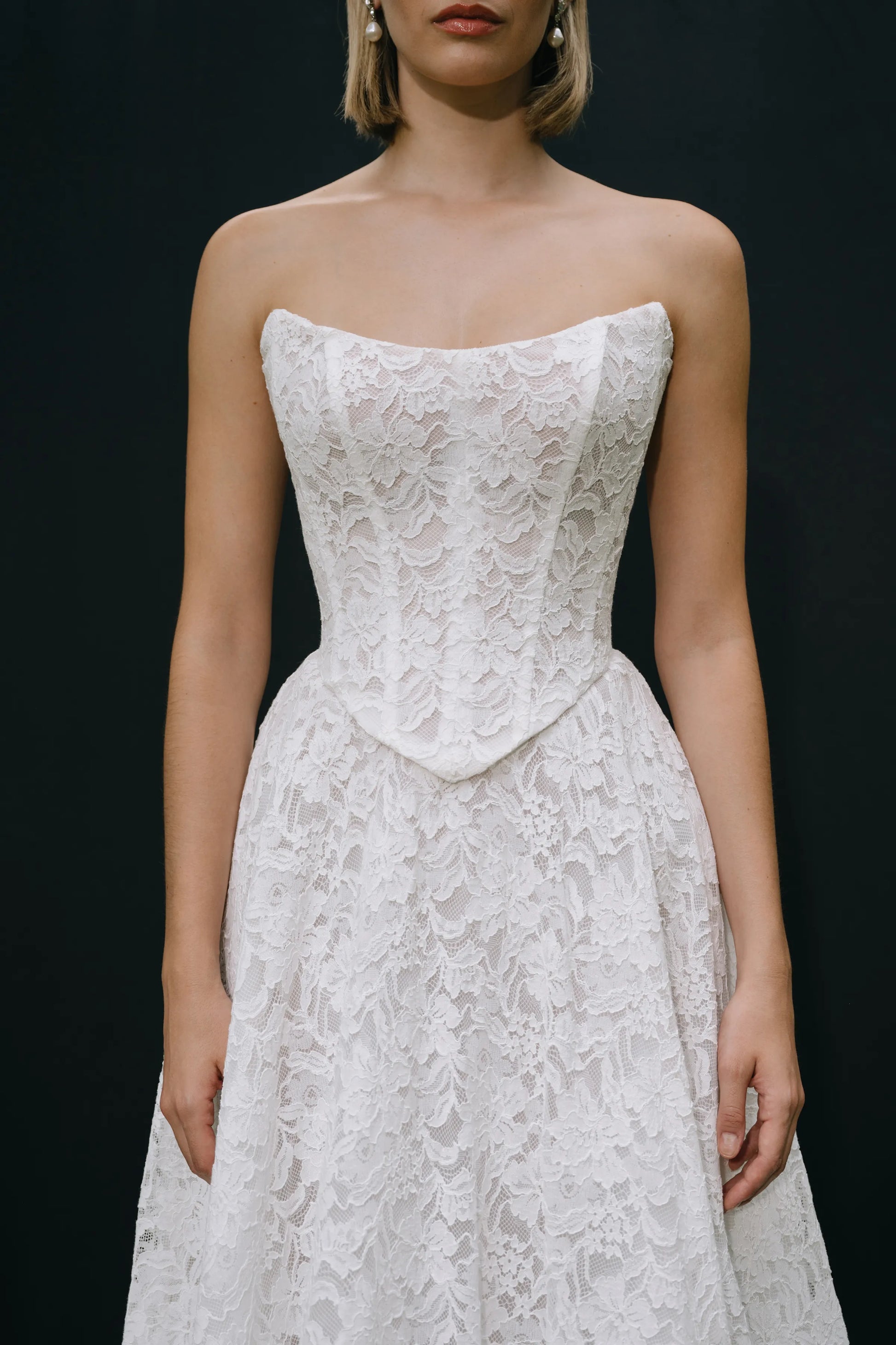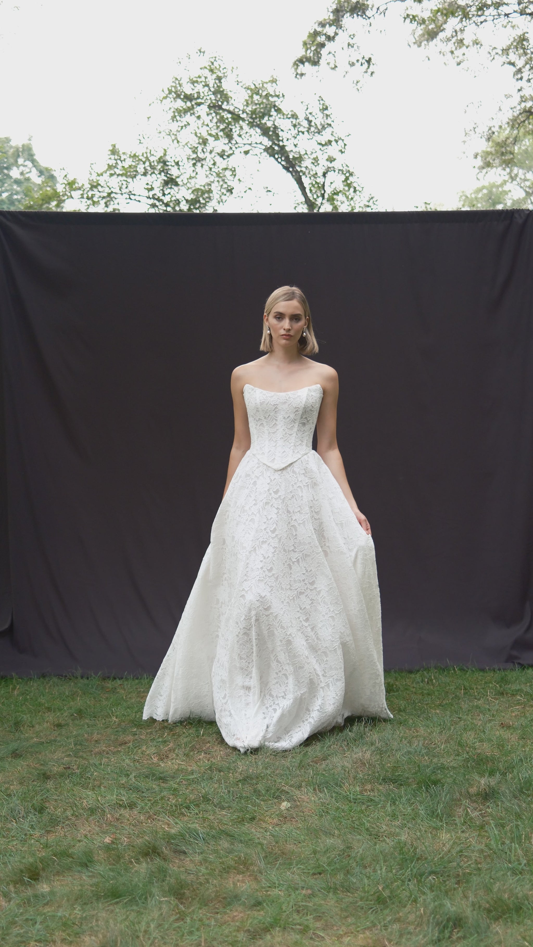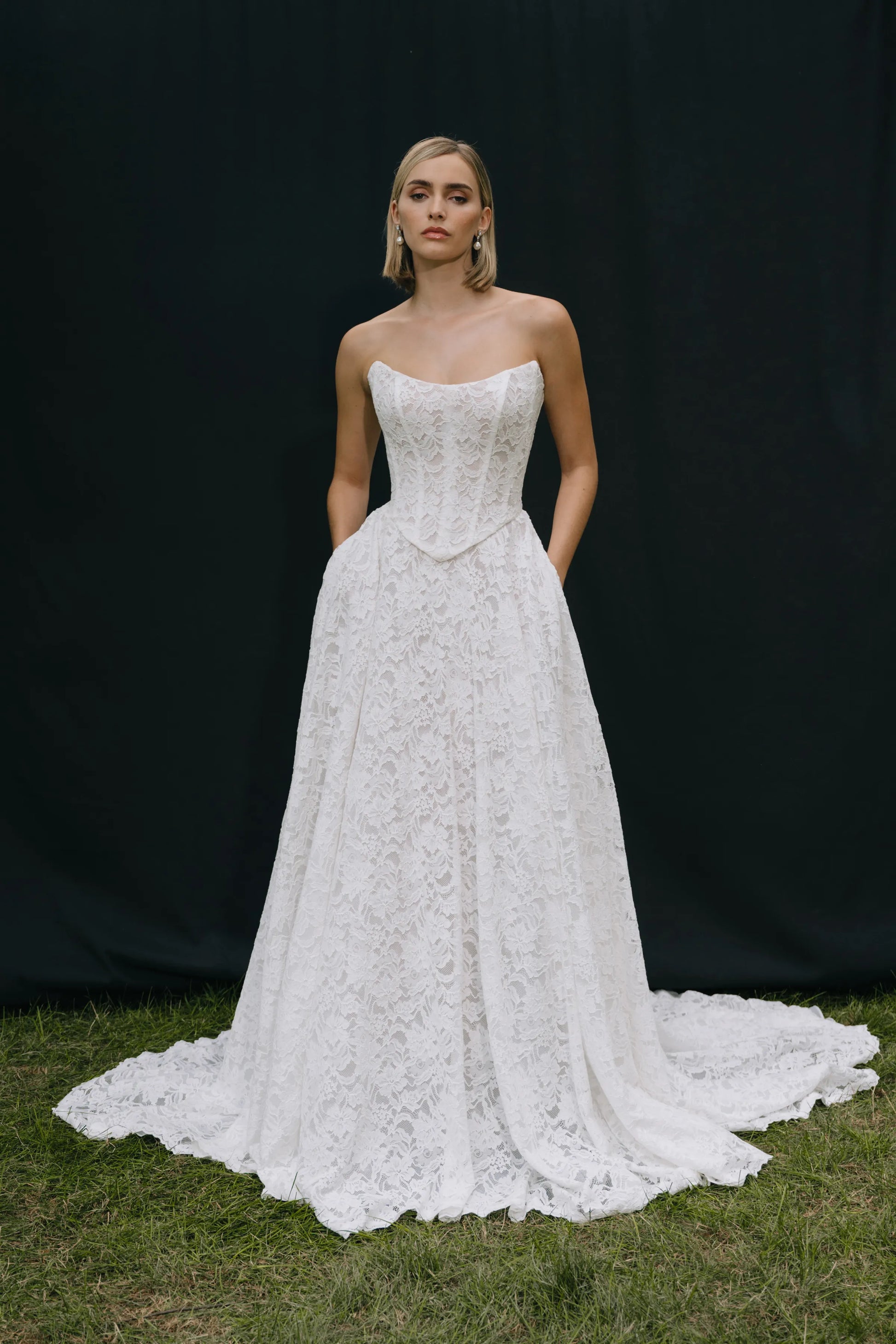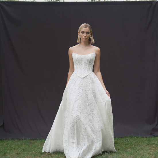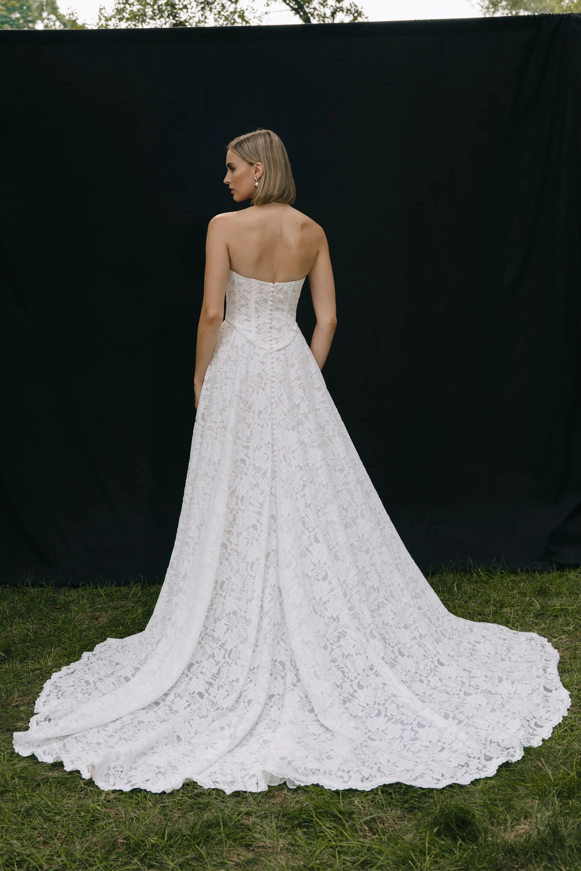 The Bella gown features a timeless, elegant silhouette enhanced by subtle feminine touches.