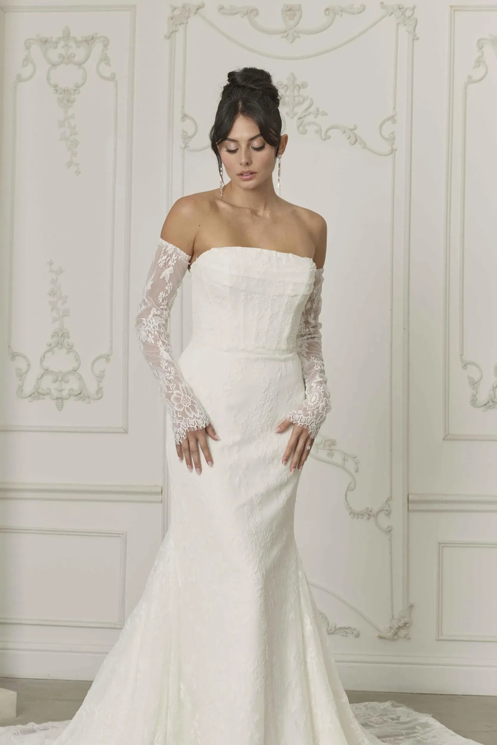 Look Three: Pair the detachable lace sleeves with the crepe gown for a sophisticated contrast.
