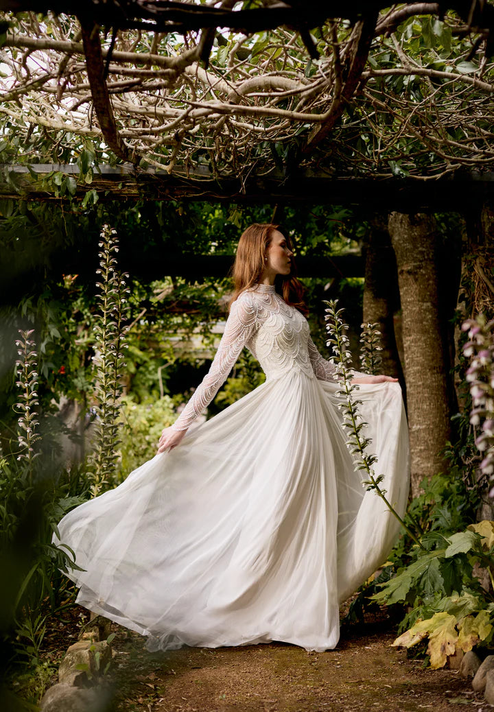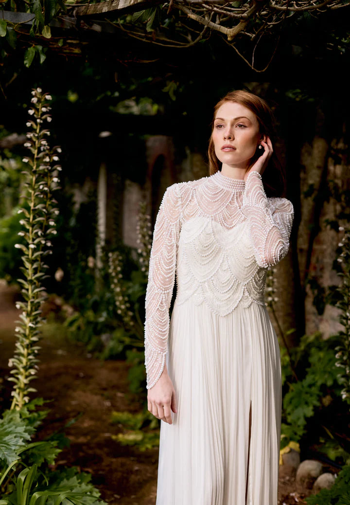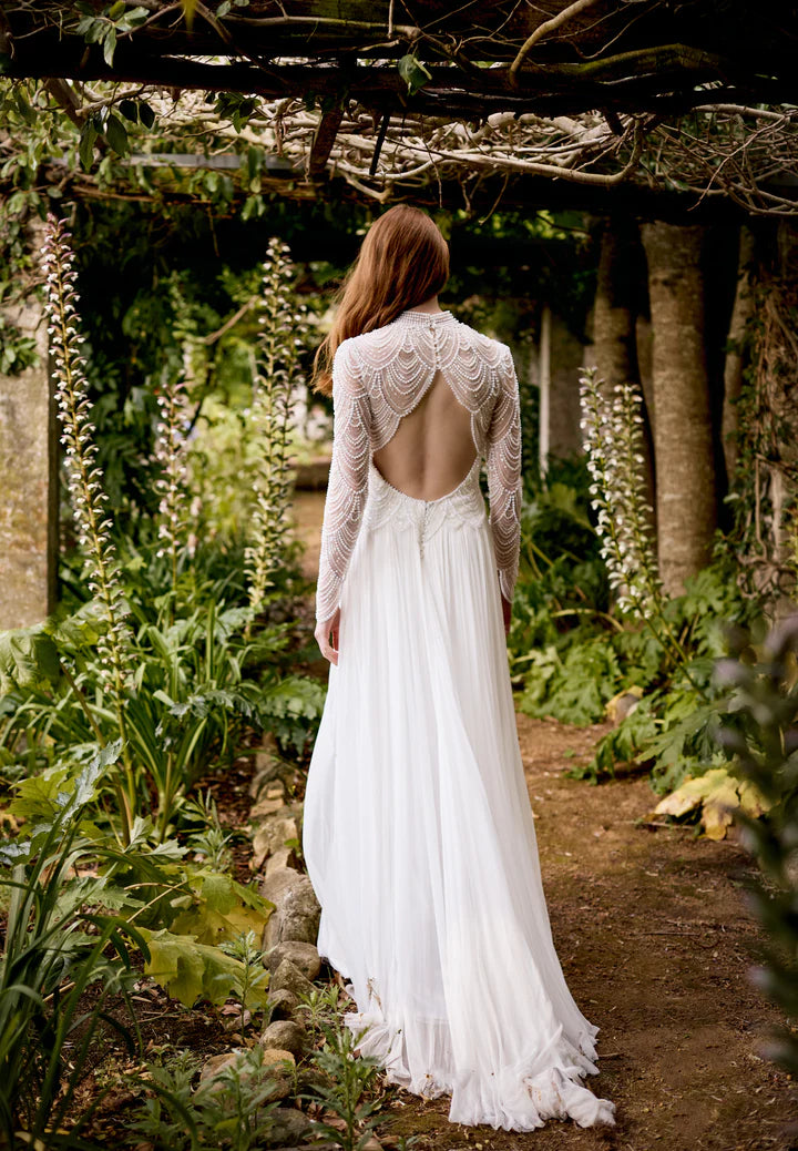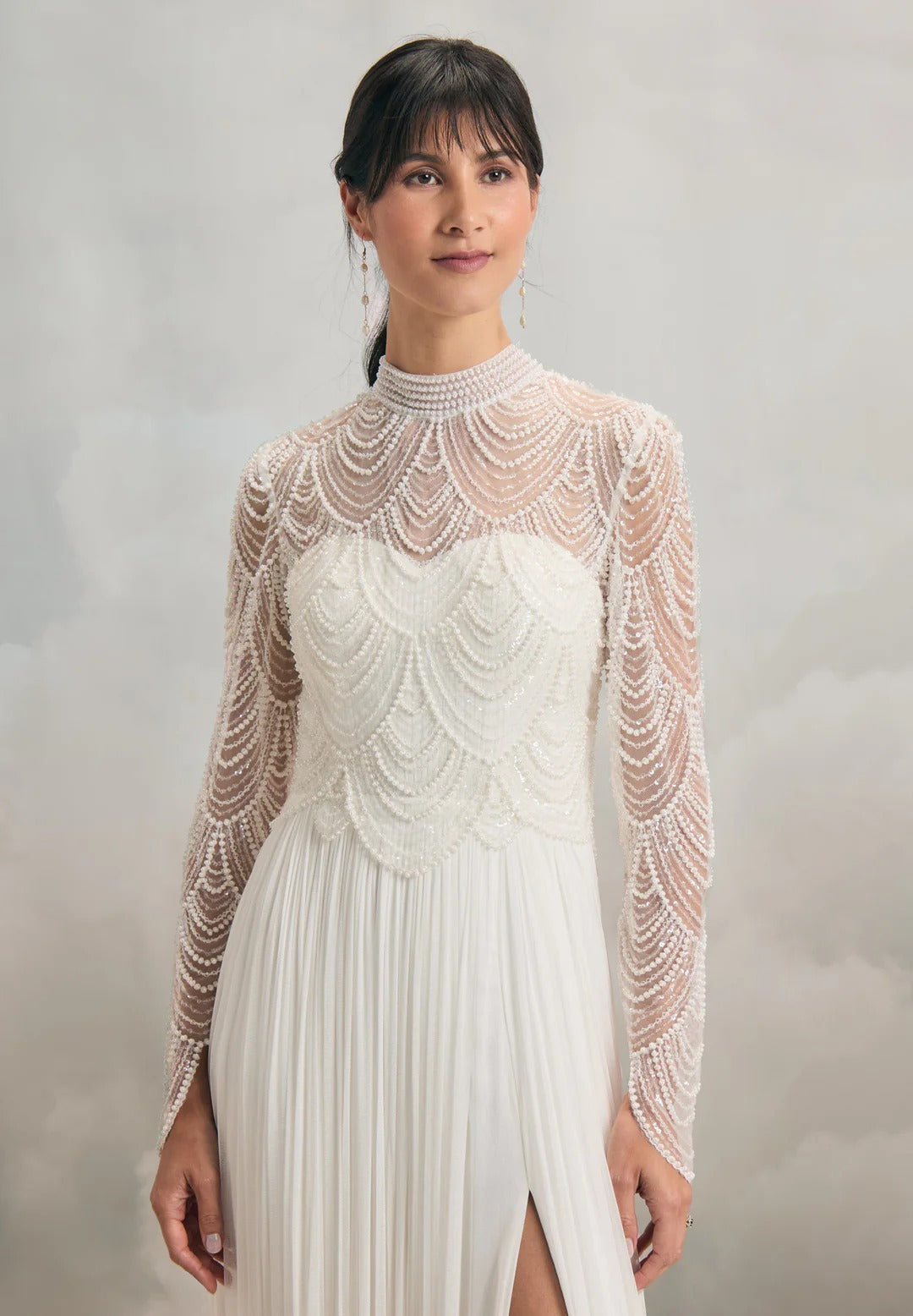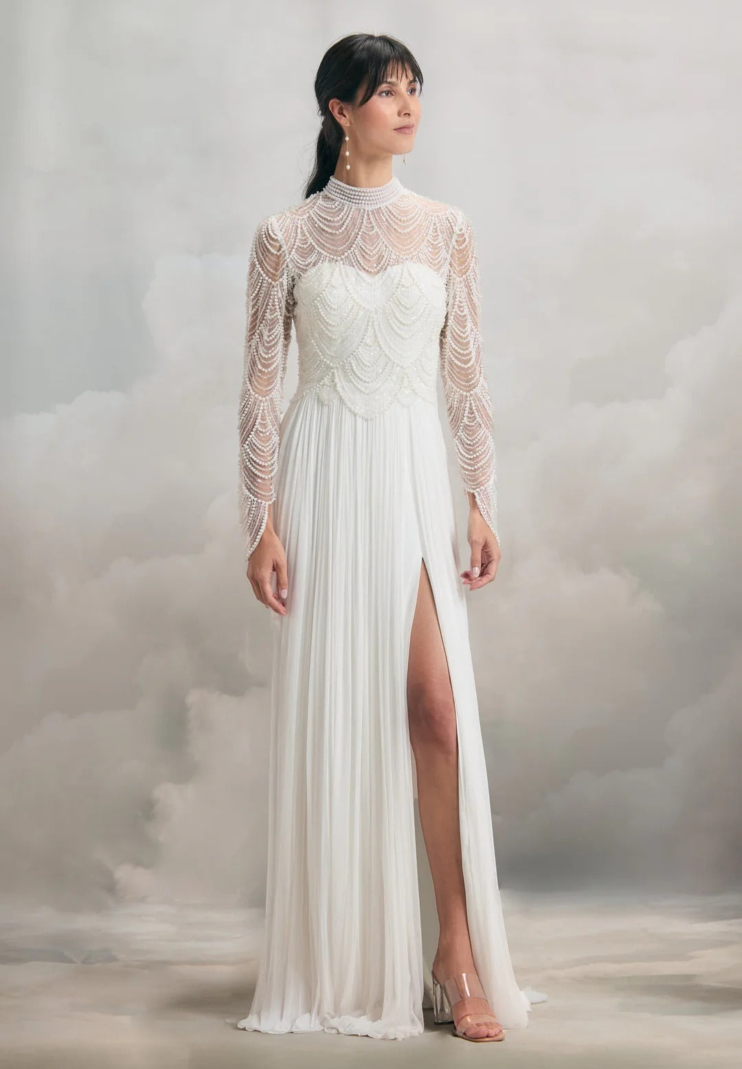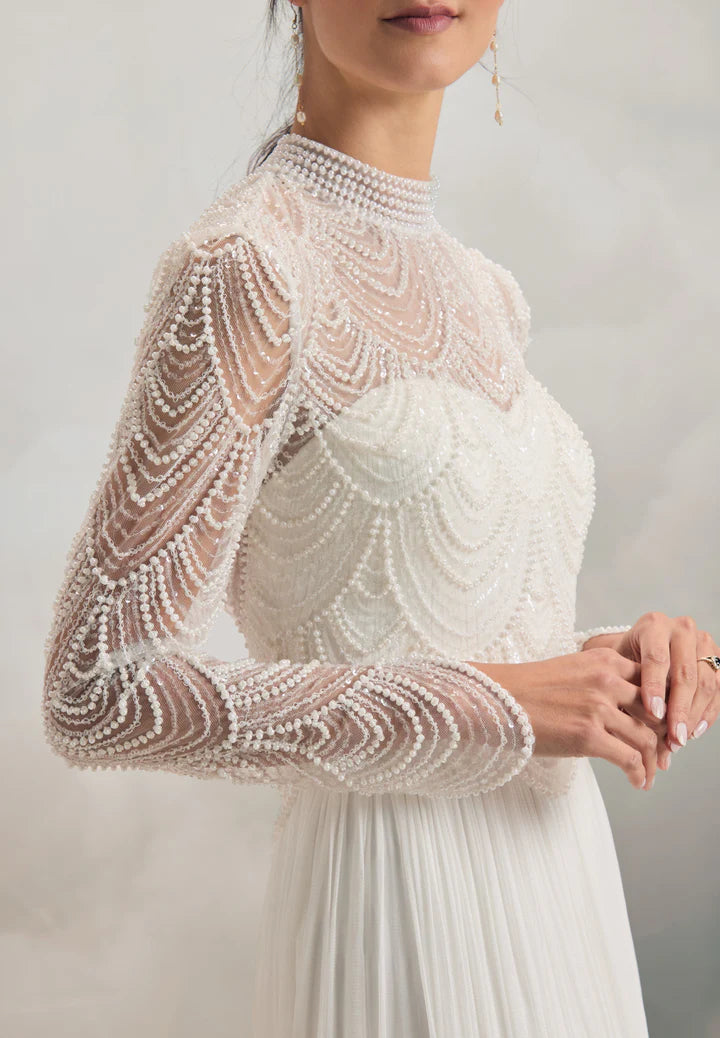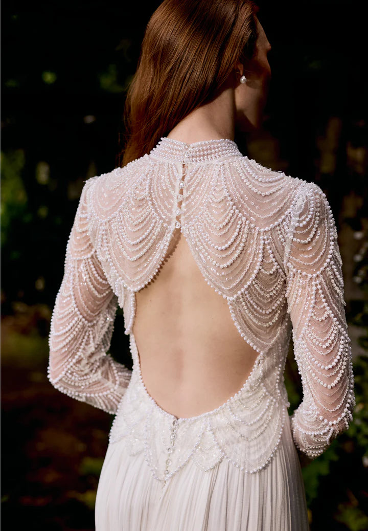 Semi-fitted long sleeves end in gracefully curved wrists, perfectly balancing the high neckline adorned with a hand-beaded collar. Scalloped detailing highlights the front and back bodice, subtly dropped waistline, and frames the dramatic open keyhole back.
