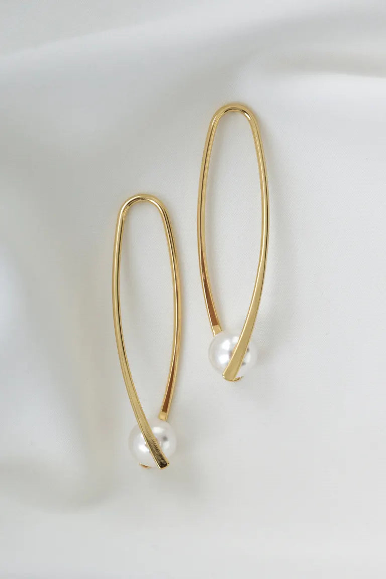 The Danna earrings offer a clean, minimalist take on the statement earring, featuring elegantly curved lines and a glistening pearl that seems to float as if by magic.
