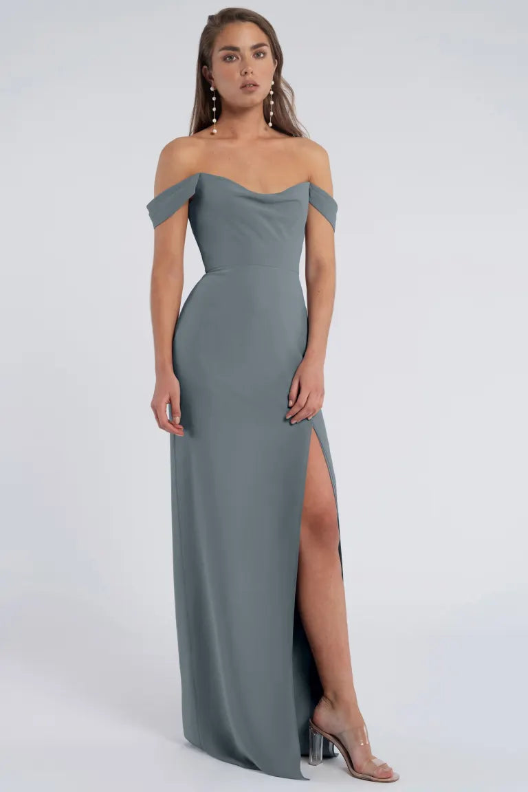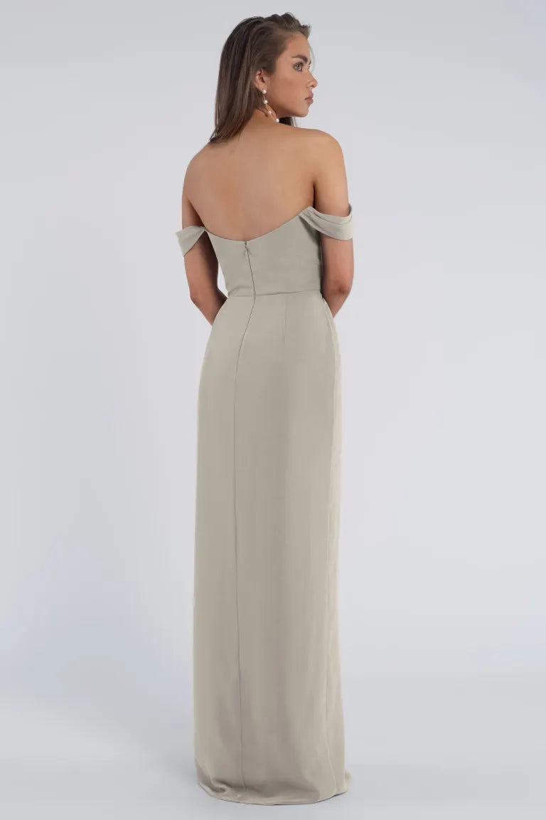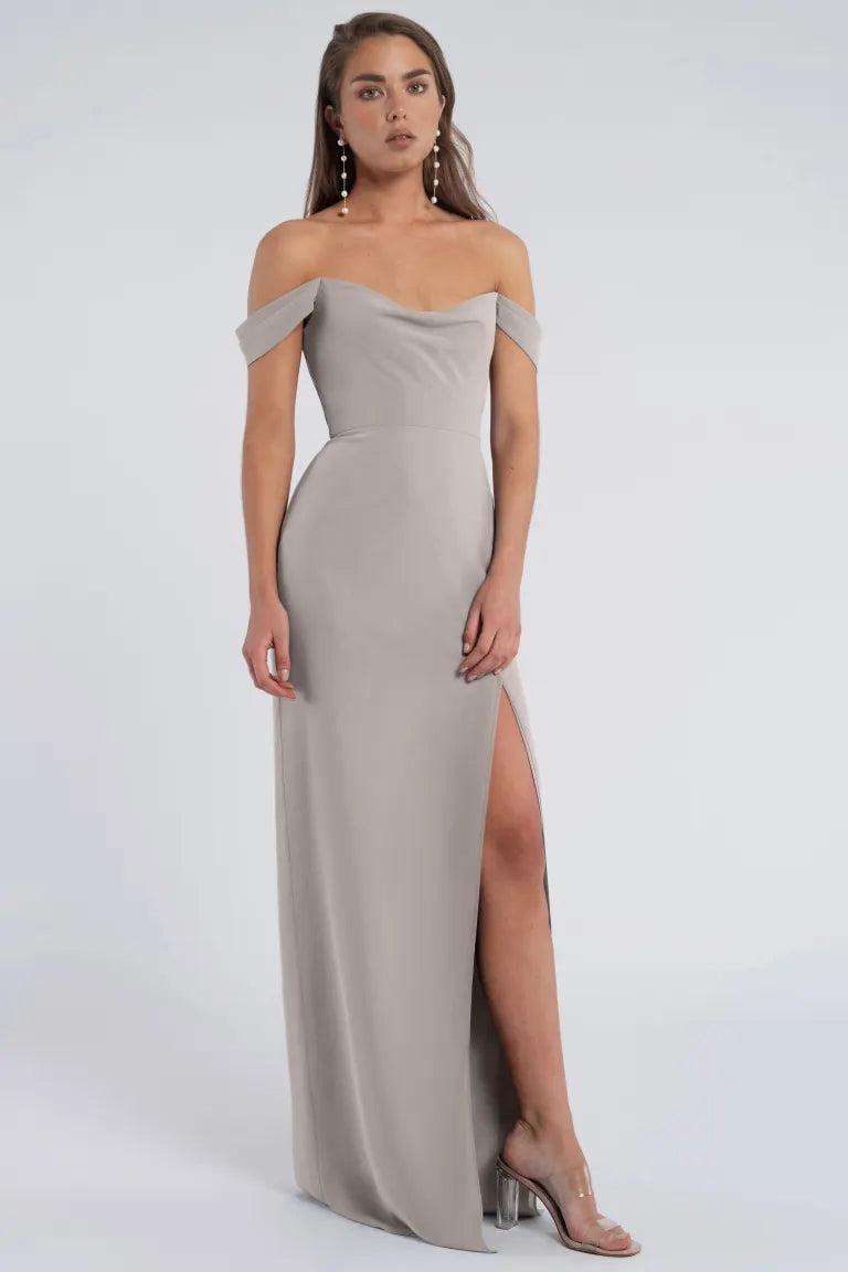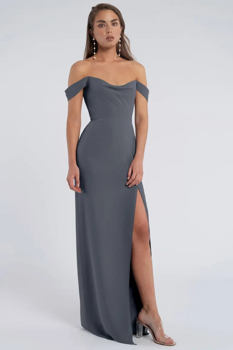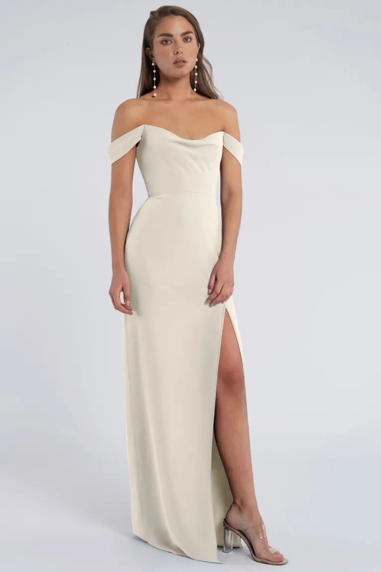 The Jacqueline dress features elegantly draped off the shoulder sleeves and a soft cowl neckline. Her bodice is fully boned with bust cups for support and an effortlessly flattering fit. Her slim skirt features a cutaway slit for an alluring peek of skin.