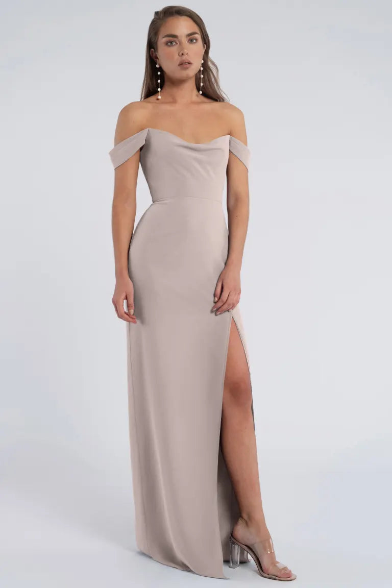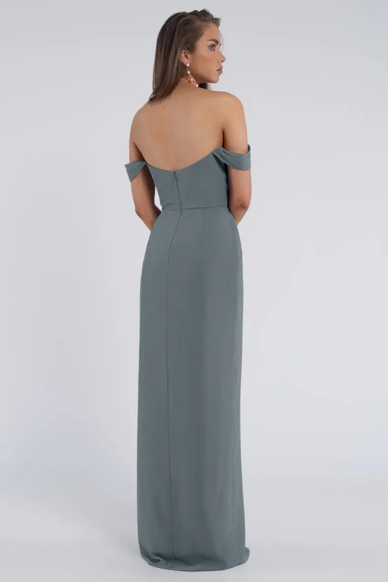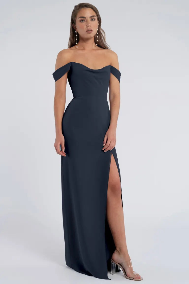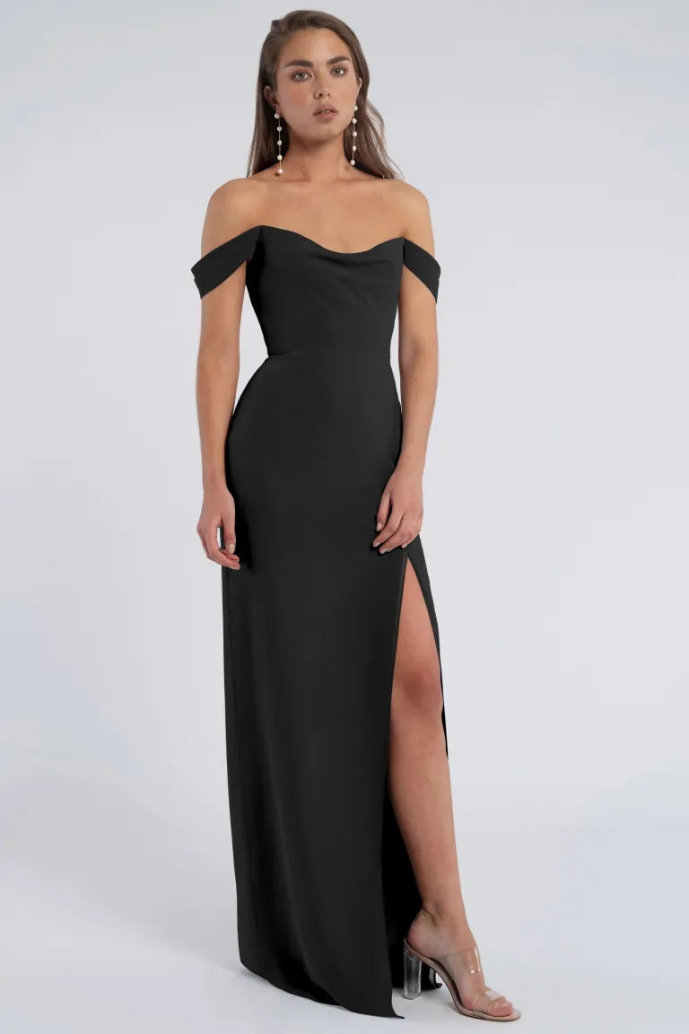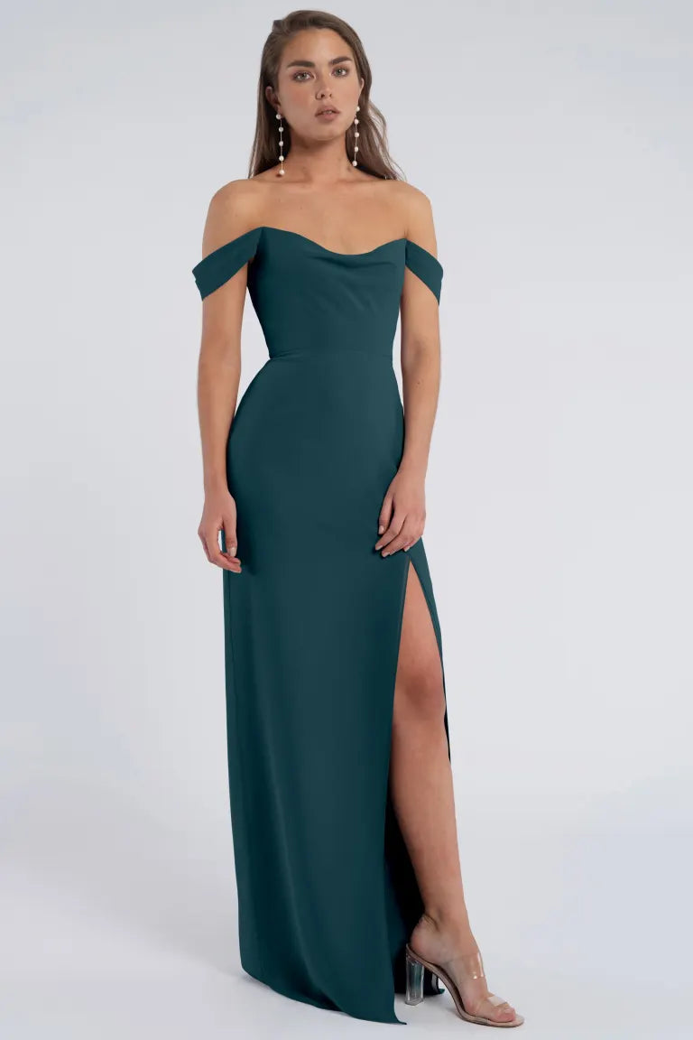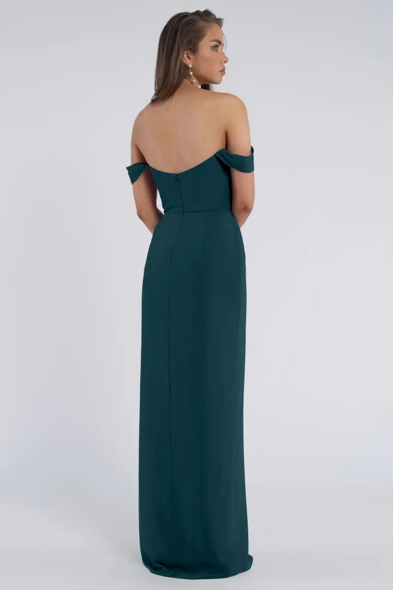 The Jacqueline dress features elegantly draped off the shoulder sleeves and a soft cowl neckline. Her bodice is fully boned with bust cups for support and an effortlessly flattering fit. Her slim skirt features a cutaway slit for an alluring peek of skin.