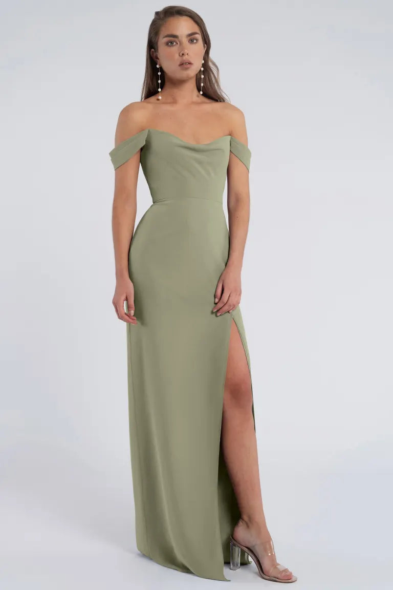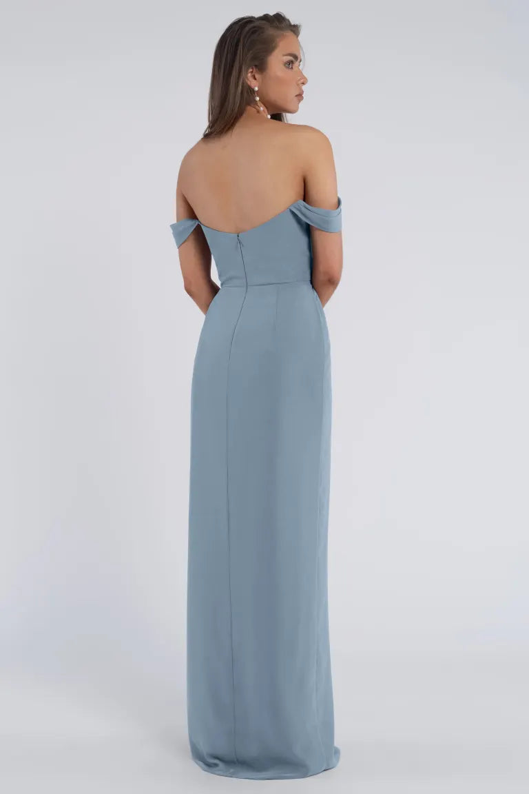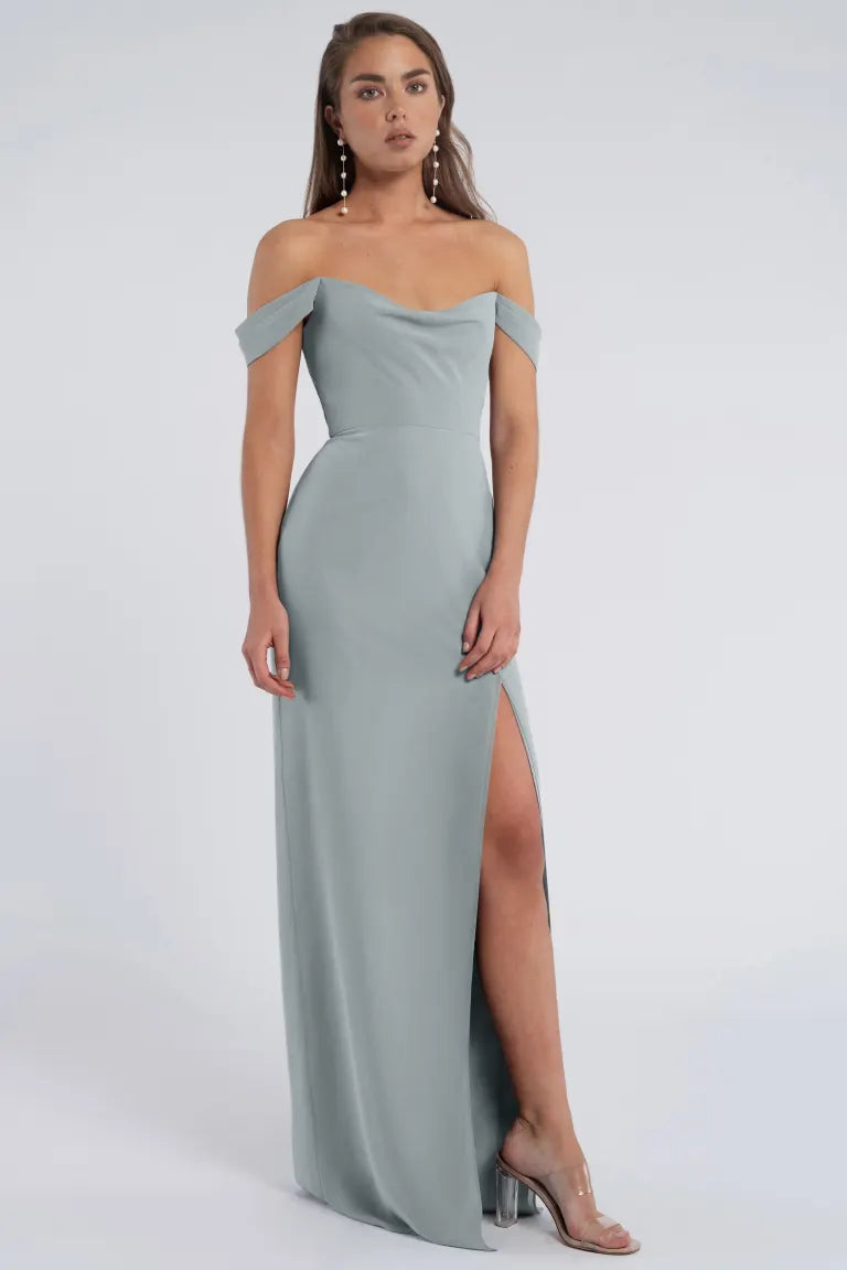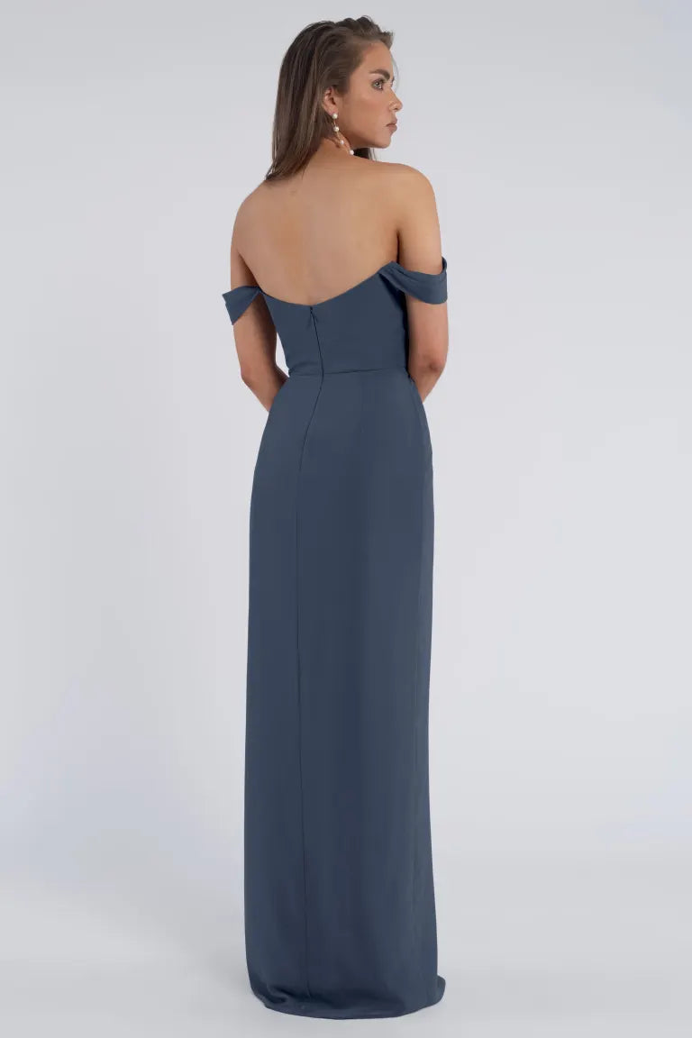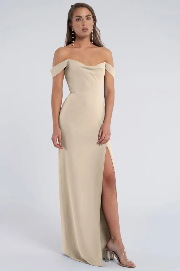 The Jacqueline dress features elegantly draped off the shoulder sleeves and a soft cowl neckline. Her bodice is fully boned with bust cups for support and an effortlessly flattering fit. Her slim skirt features a cutaway slit for an alluring peek of skin.