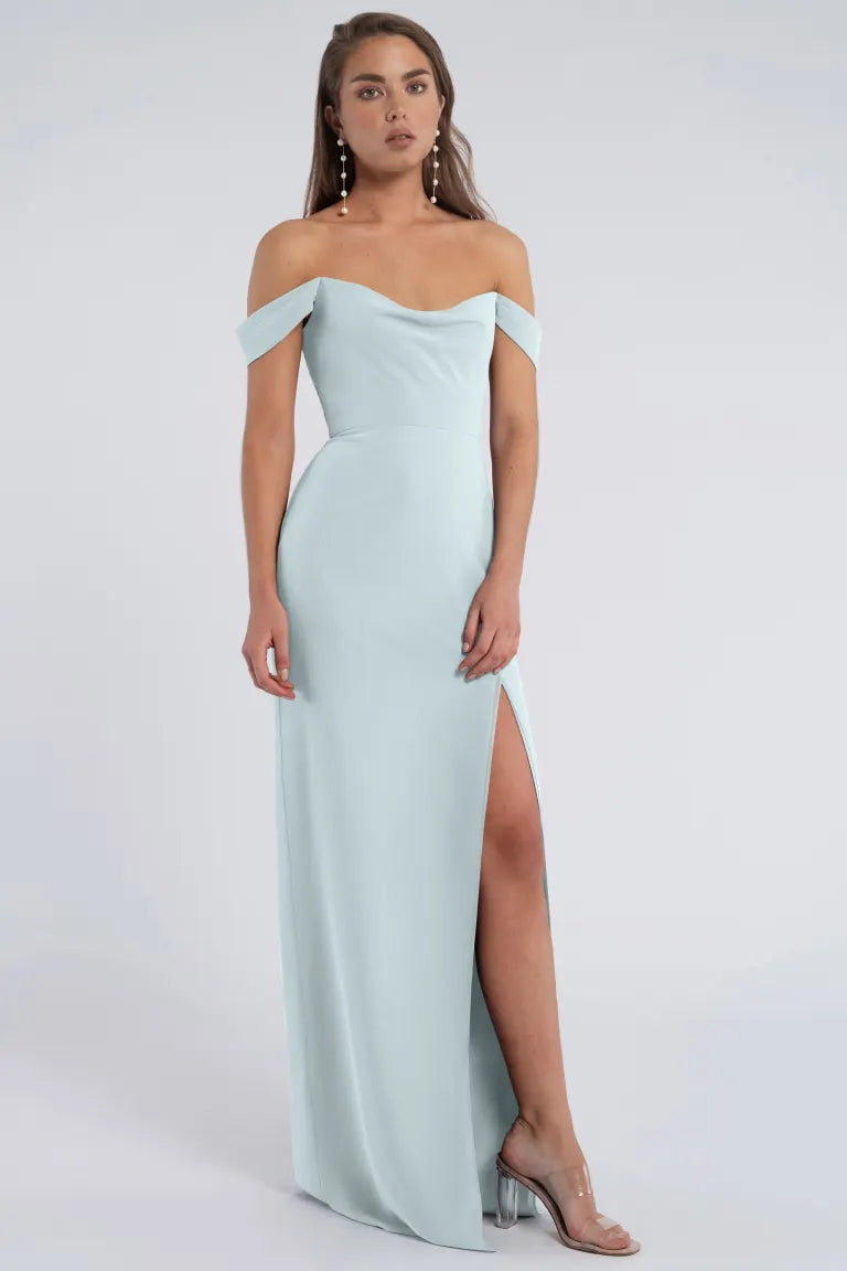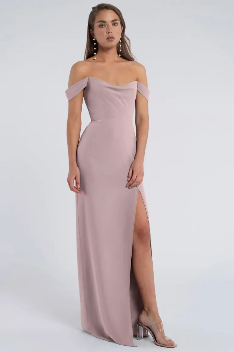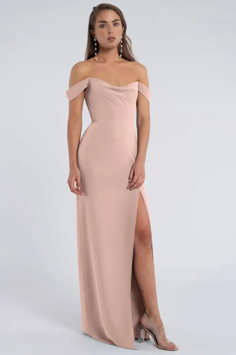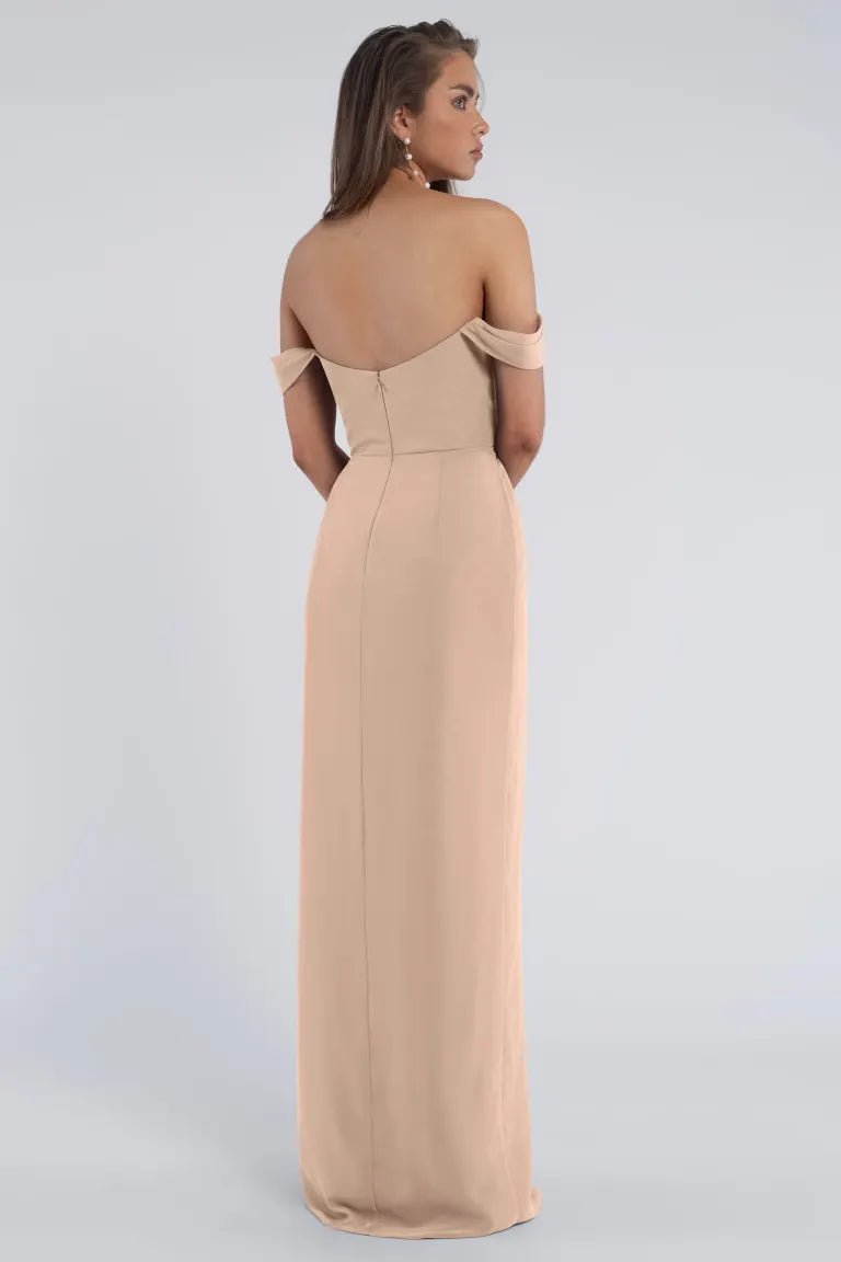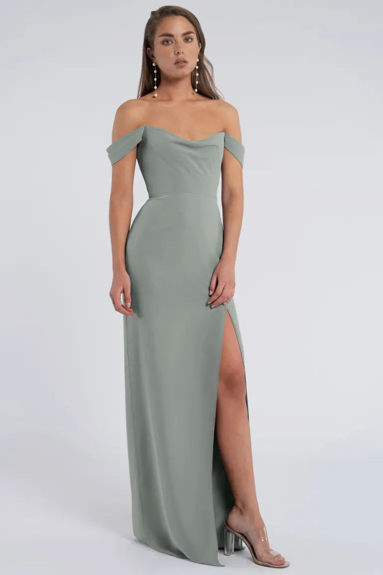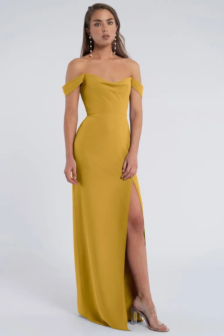 The Jacqueline dress features elegantly draped off the shoulder sleeves and a soft cowl neckline. Her bodice is fully boned with bust cups for support and an effortlessly flattering fit. Her slim skirt features a cutaway slit for an alluring peek of skin.