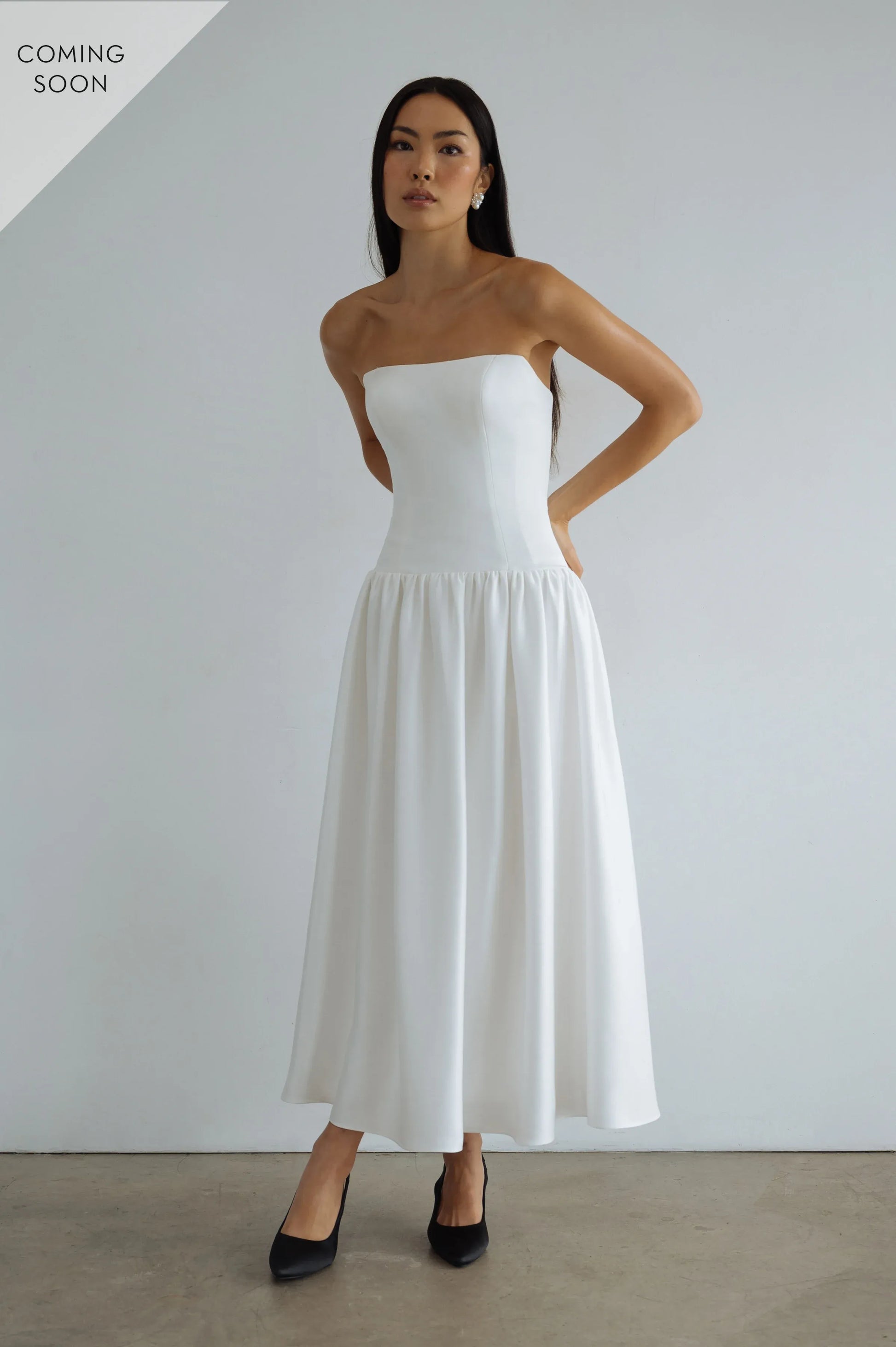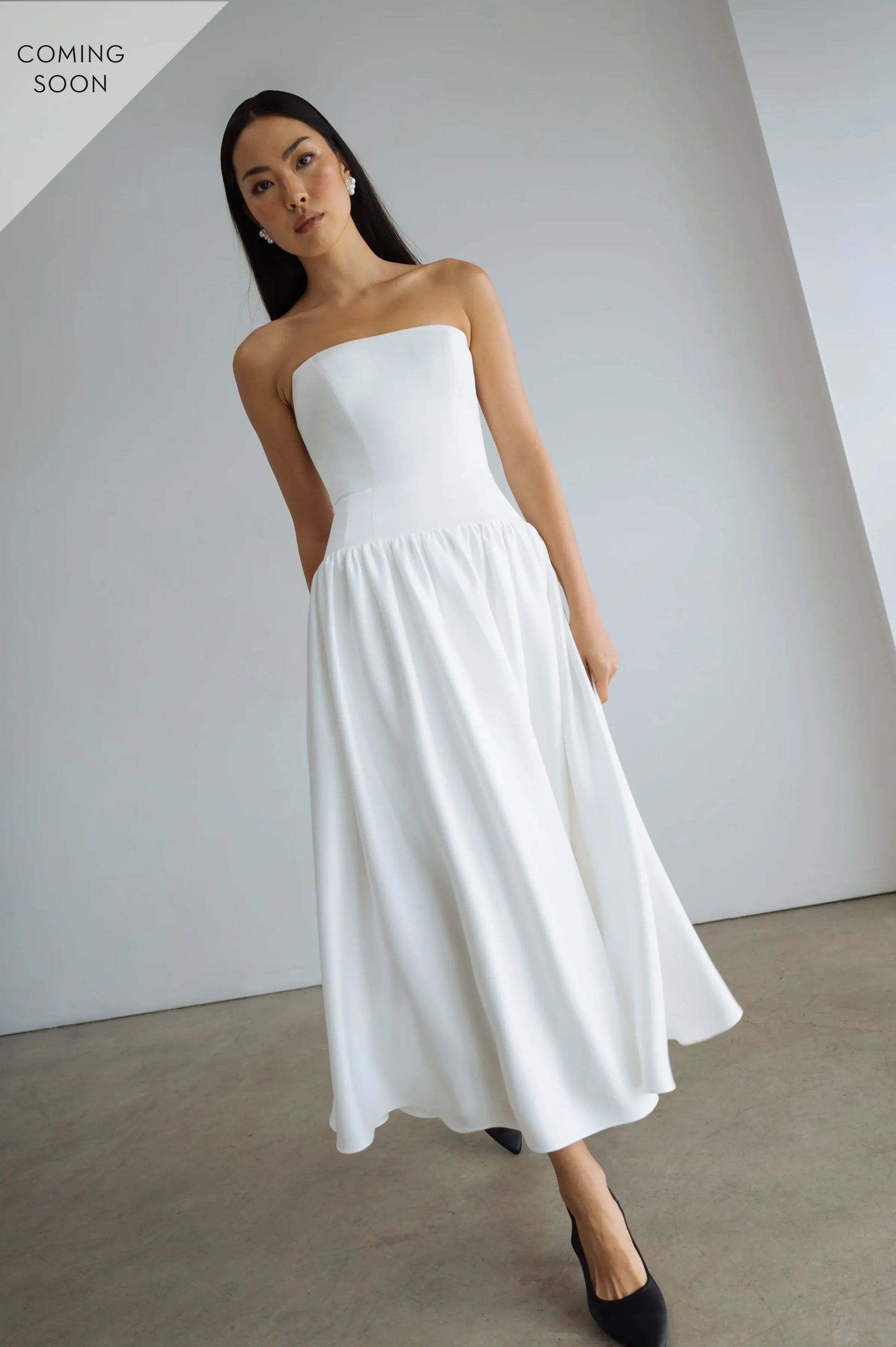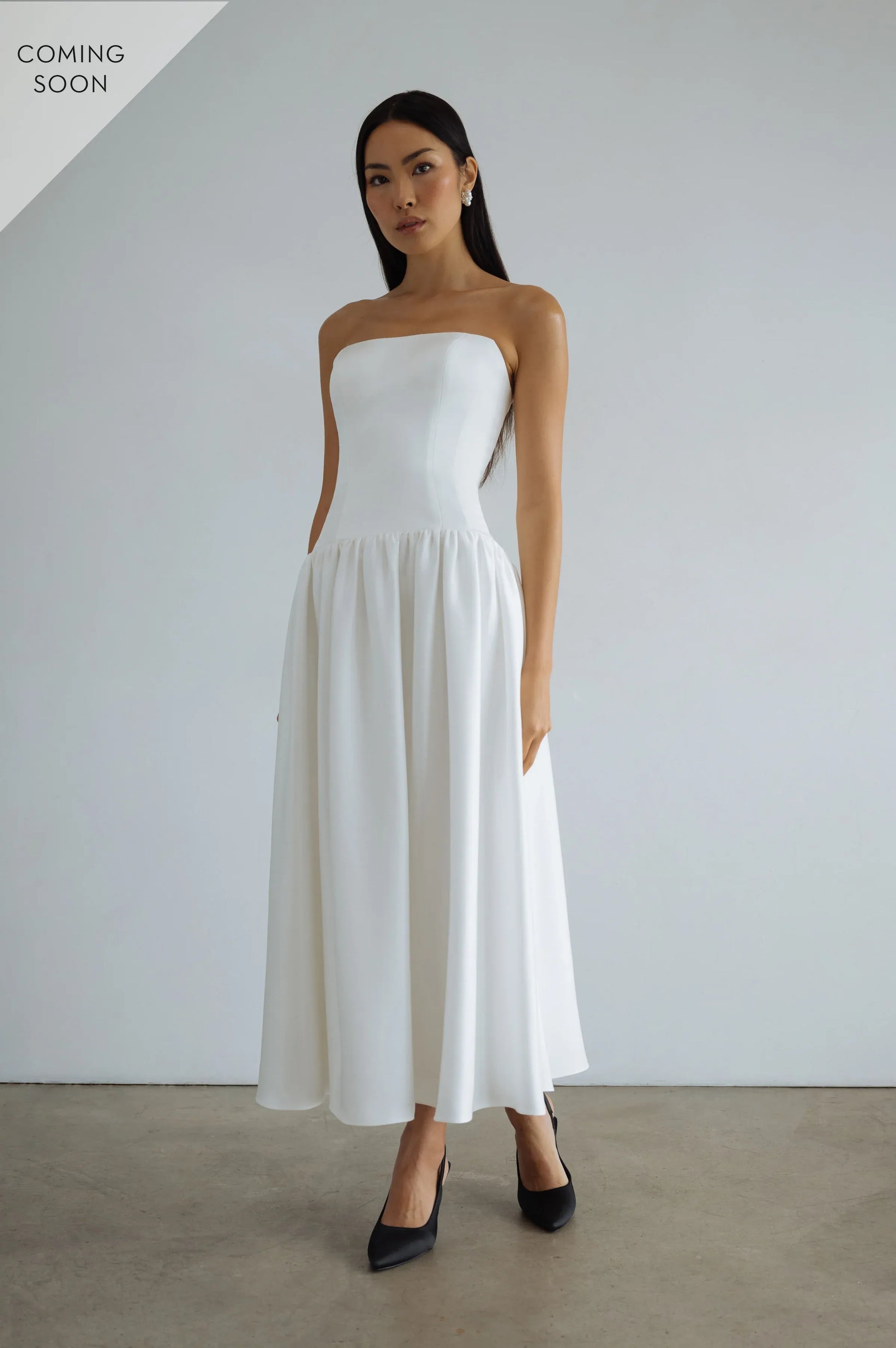 The Joanna dress, with her structured drop waist bodice and full flowing midi skirt is an effortlessly elegant option for any bridal event.