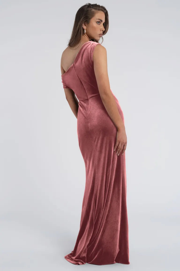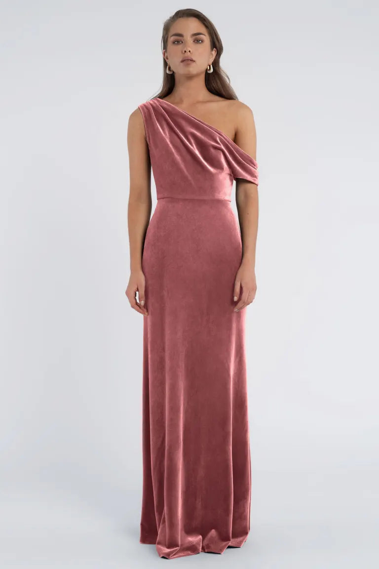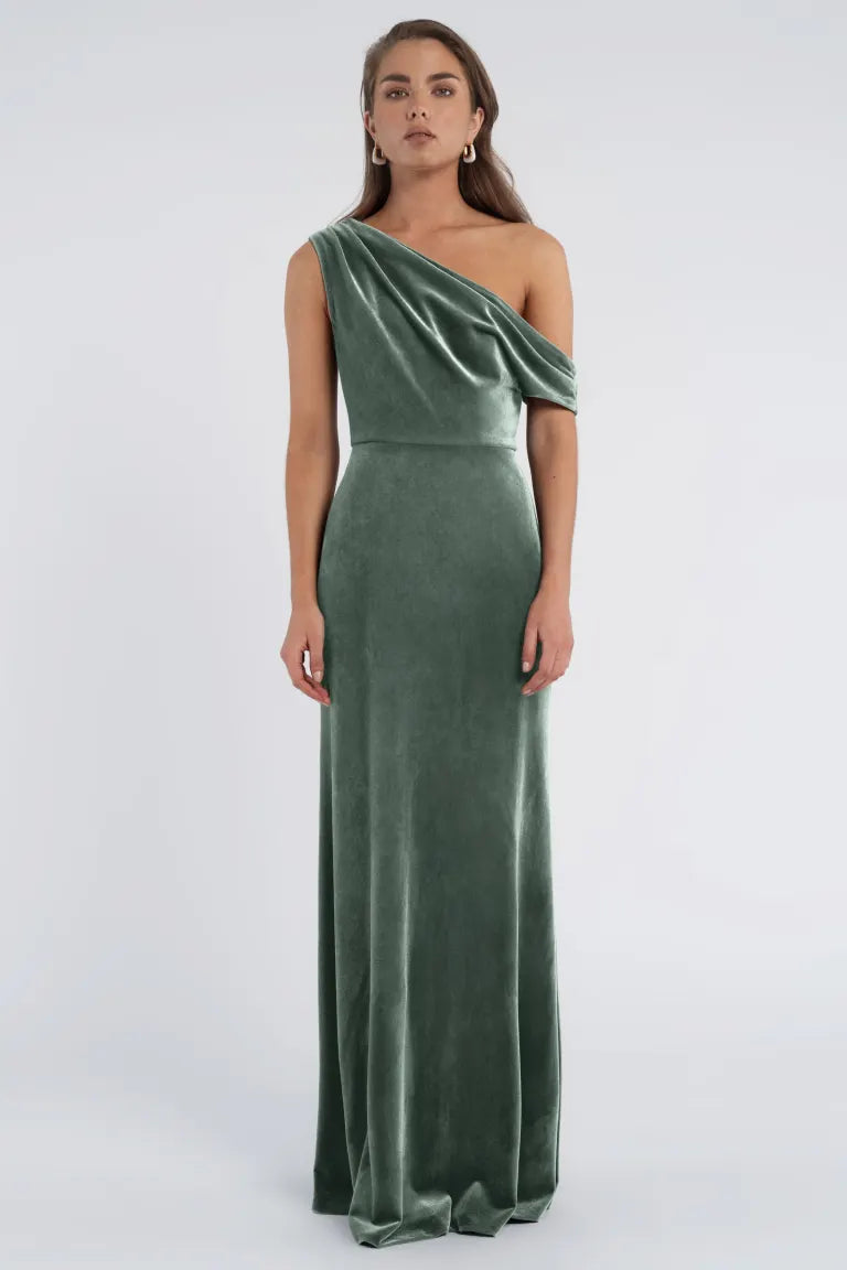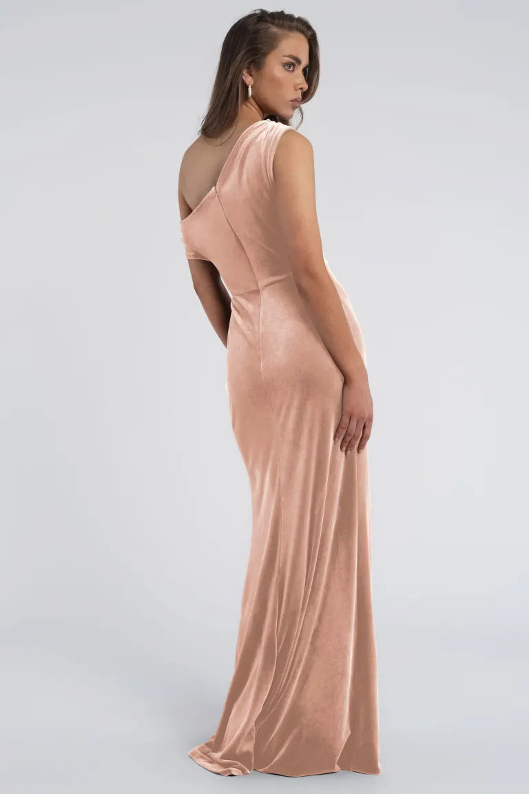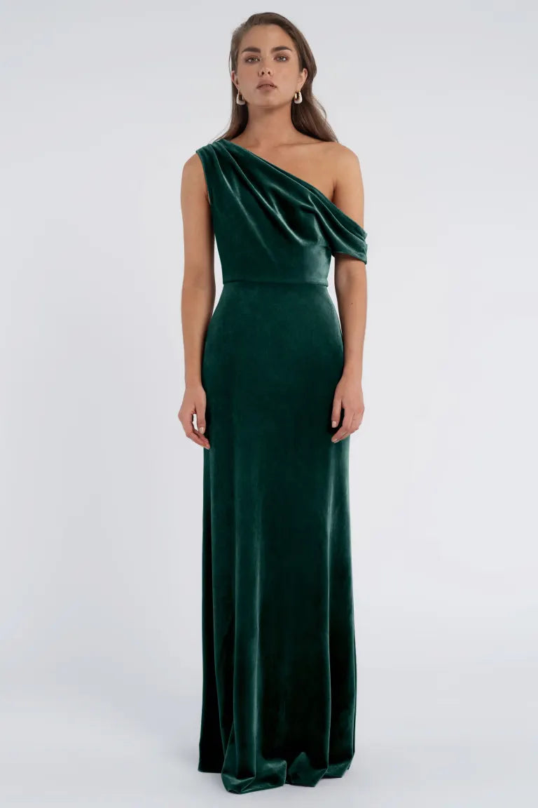 The Jordan dress is effortlessly glamorous. She features an asymmetrically draped neckline with pleat details to highlight the highs and lows of our lustrous stretch velvet fabric. The slinky bias cut skirt flatters your every curve.