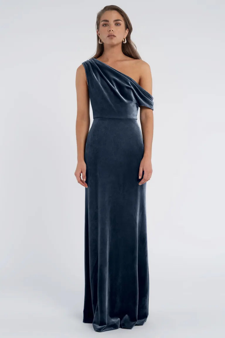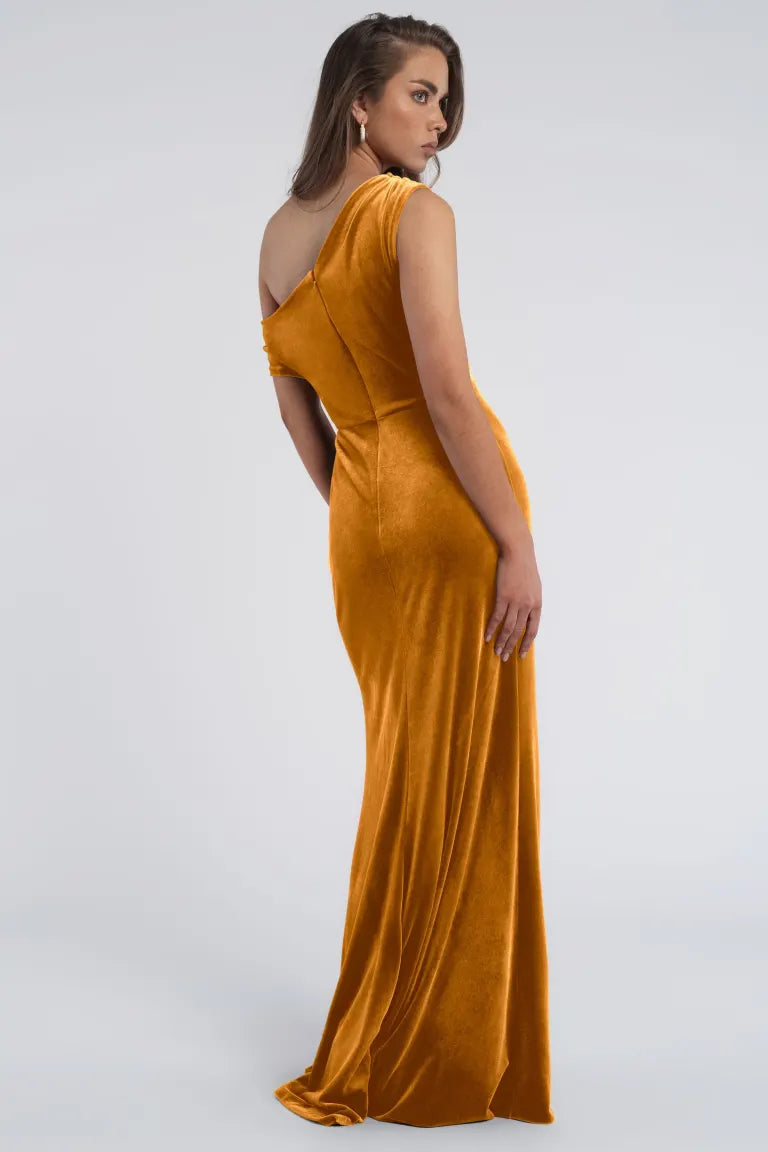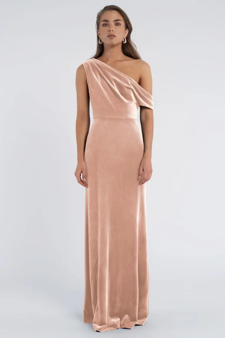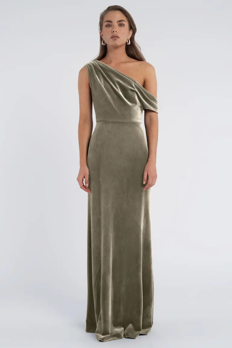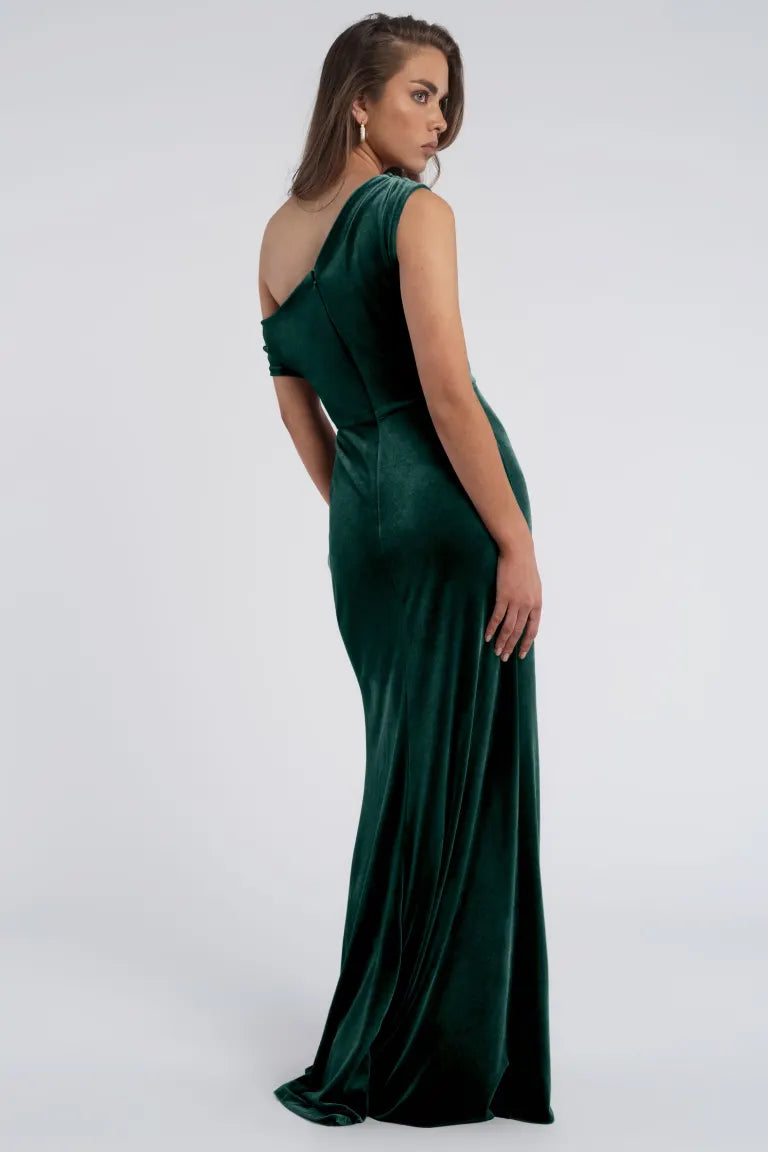 The Jordan dress is effortlessly glamorous. She features an asymmetrically draped neckline with pleat details to highlight the highs and lows of our lustrous stretch velvet fabric. The slinky bias cut skirt flatters your every curve.