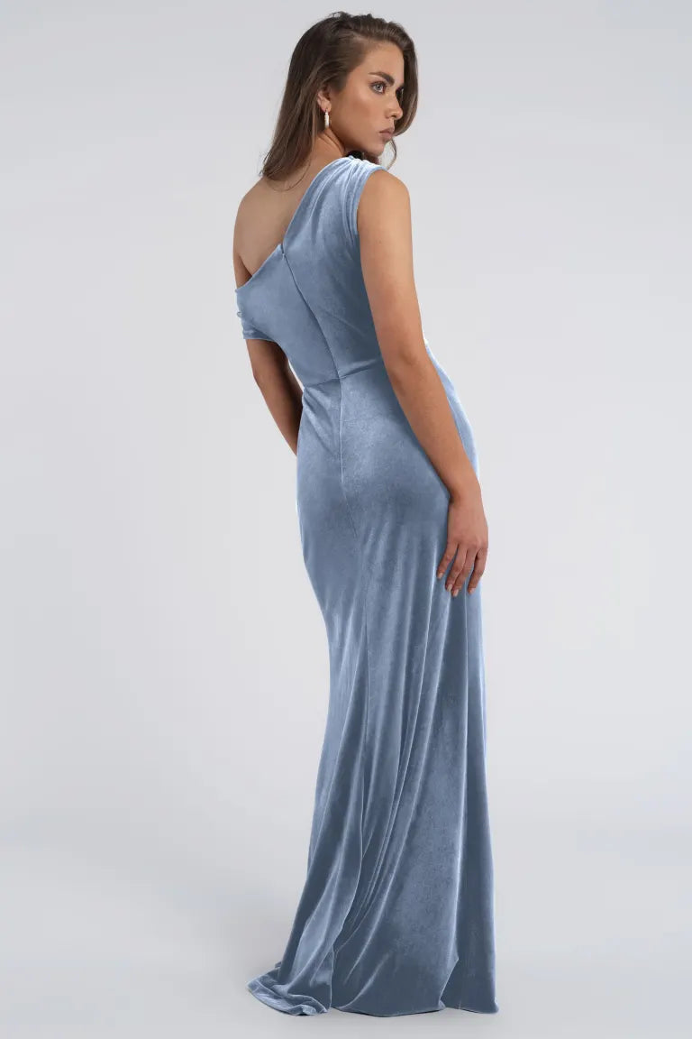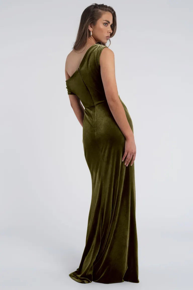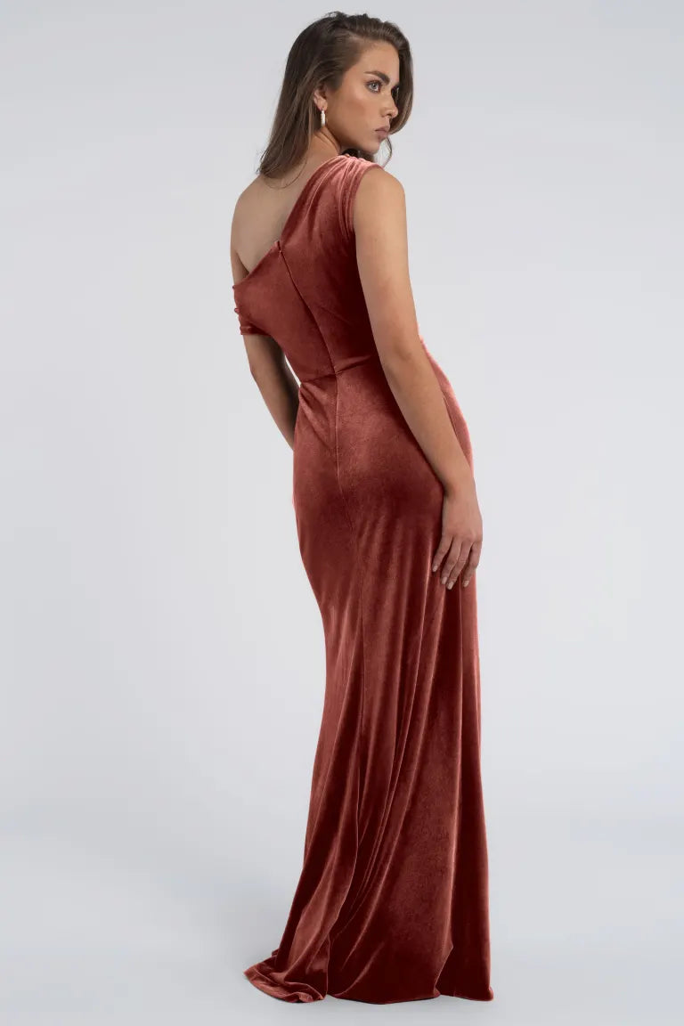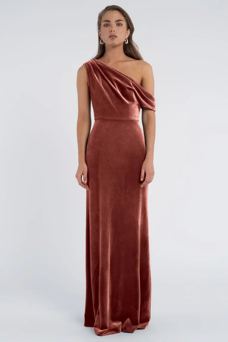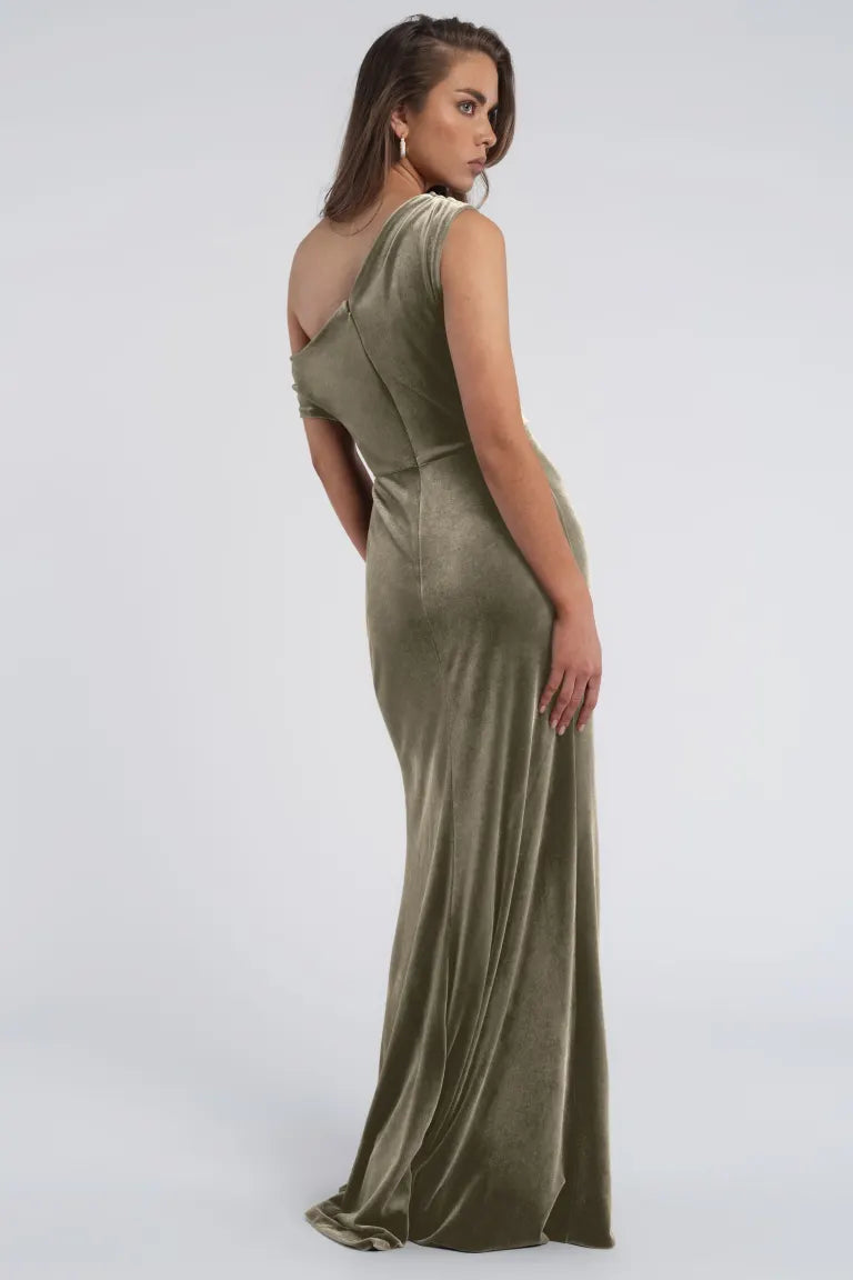 The Jordan dress is effortlessly glamorous. She features an asymmetrically draped neckline with pleat details to highlight the highs and lows of our lustrous stretch velvet fabric. The slinky bias cut skirt flatters your every curve.