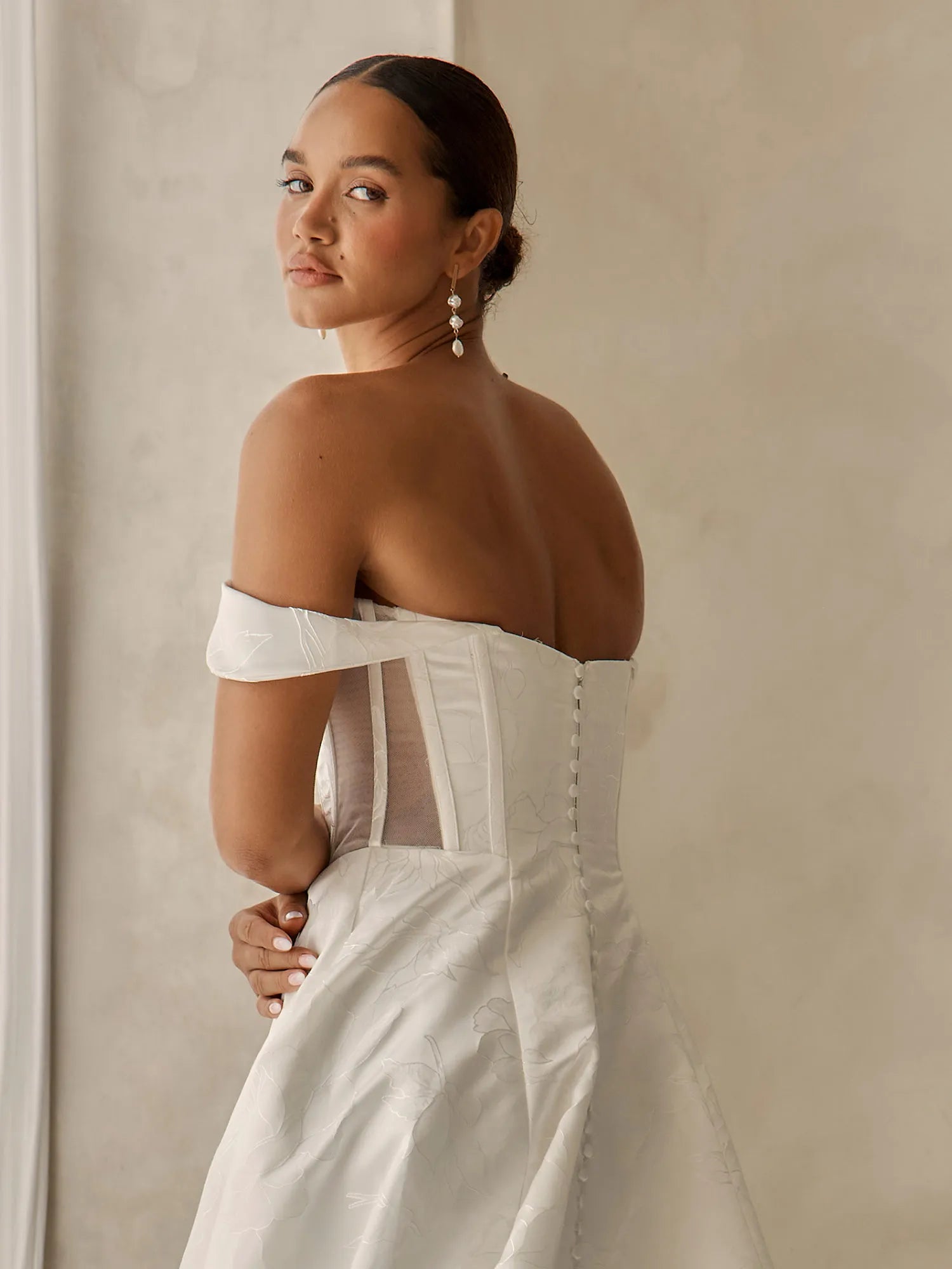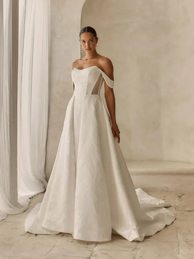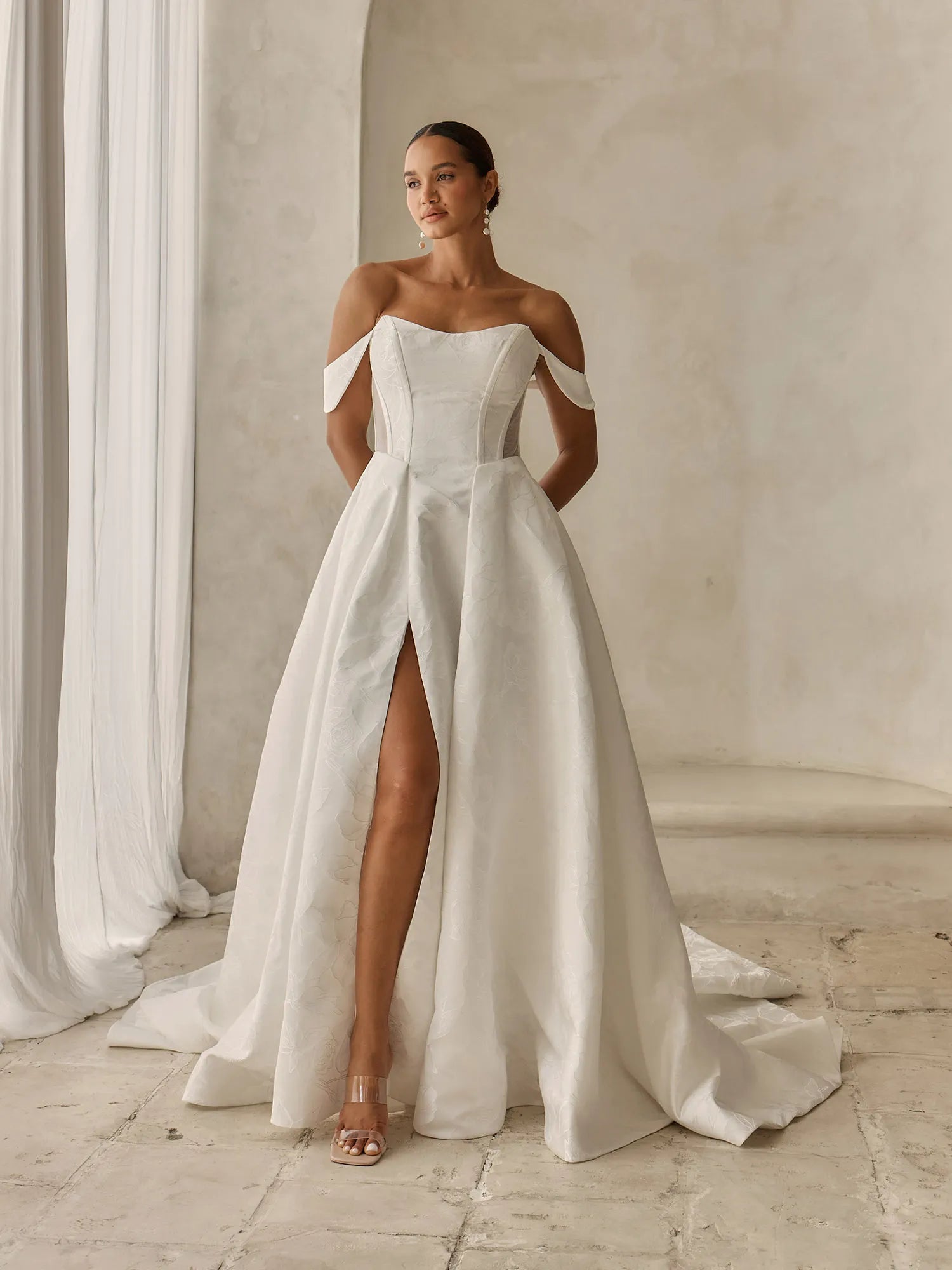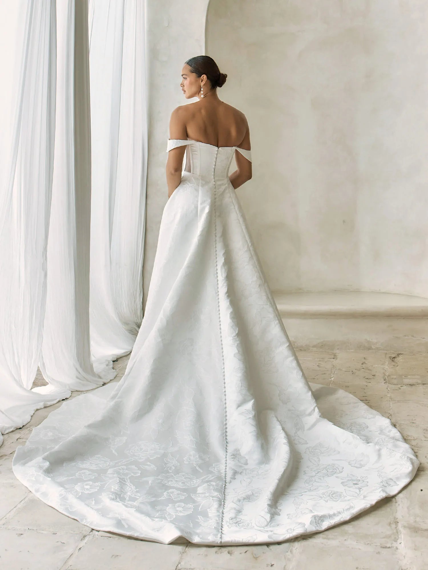 FLORAL JACQUARD A-LINE GOWN, SCOOPED NECKLINE W/ DETACHABLE OFF-THE-SHOULDER STRAPS, CORSET BODICE & BACK W/ ILLUSION SIDE CUTOUTS, PLEATED SKIRT W/ A SLIT, BUTTONS & A CHAPEL TRAIN