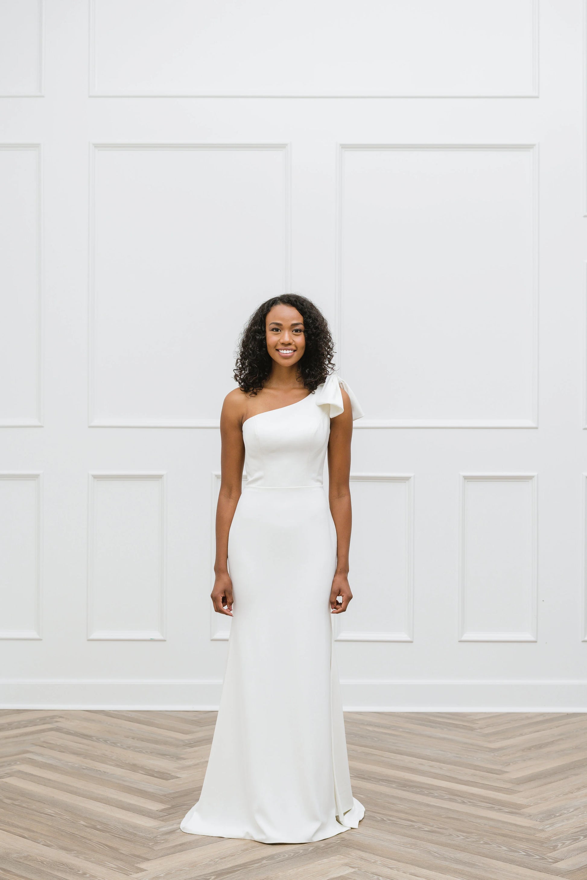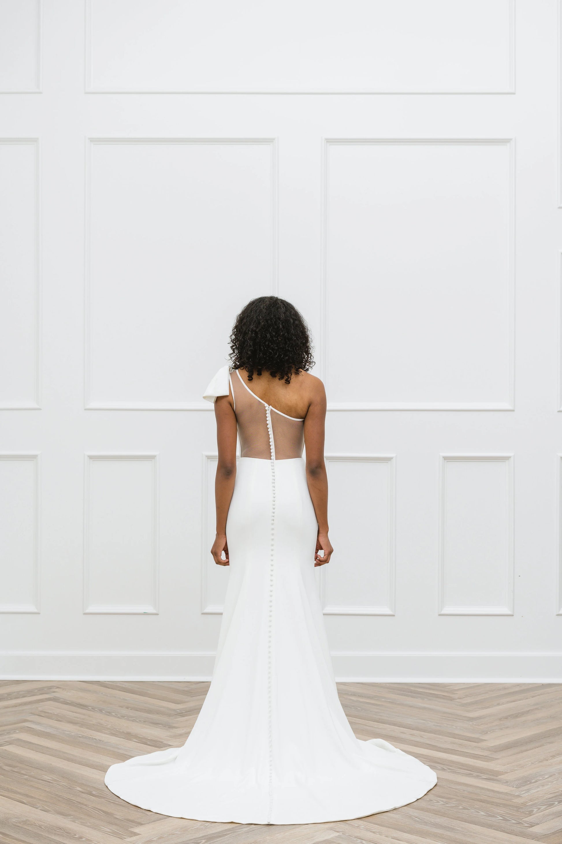 Crafted in chic jersey-satin, this one-shoulder gown features a flattering fit-and-flare silhouette. A detachable jersey-satin bow adds a striking accent at the shoulder, while the illusion back is finished with a zipper and a row of buttons that extend gracefully from the bodice to the edge of the chapel-length train.