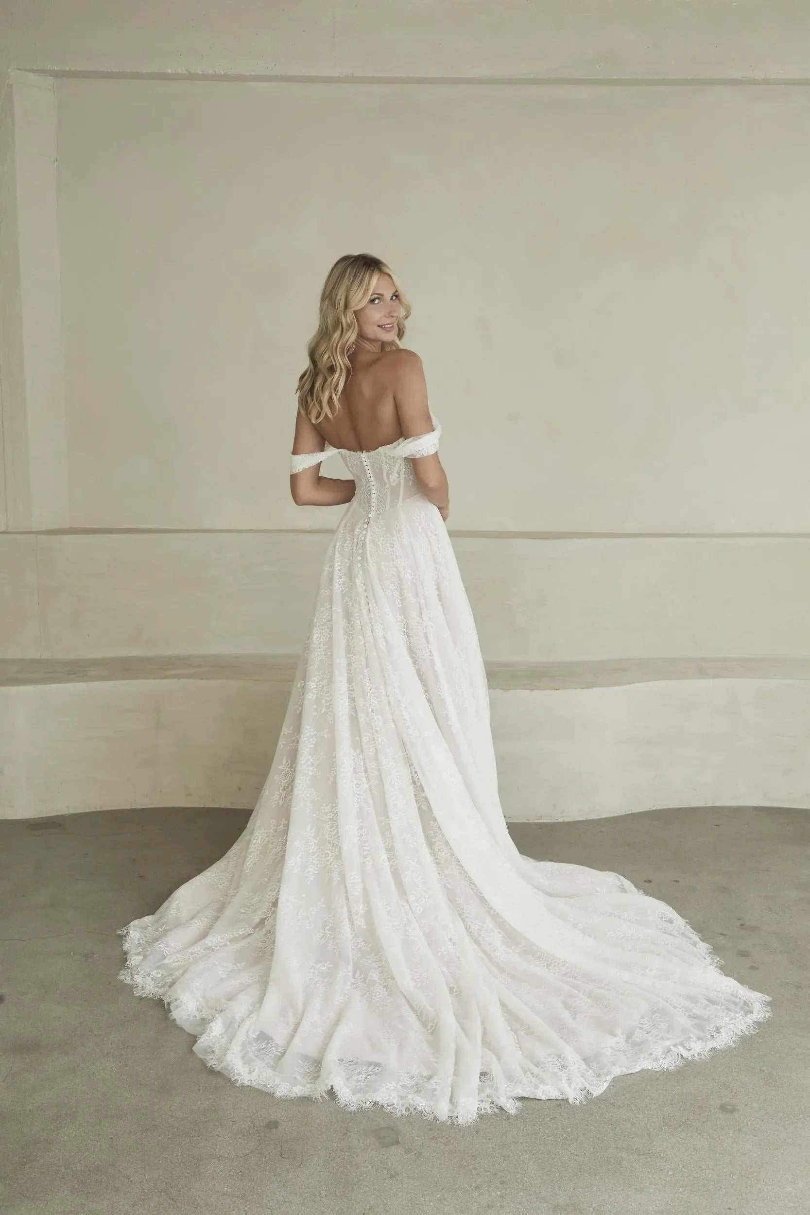The Meyer gown is a celebration of timeless elegance and romantic detail, designed for the bride seeking effortless sophistication. Crafted from delicate Chantilly lace, this A-line silhouette features a graceful sweetheart neckline complemented by a soft cowl overlay for an elevated, refined look. Off-shoulder cap sleeves lend a vintage charm, while the pointed bateau waistline and back button closure create a beautifully sculpted fit.