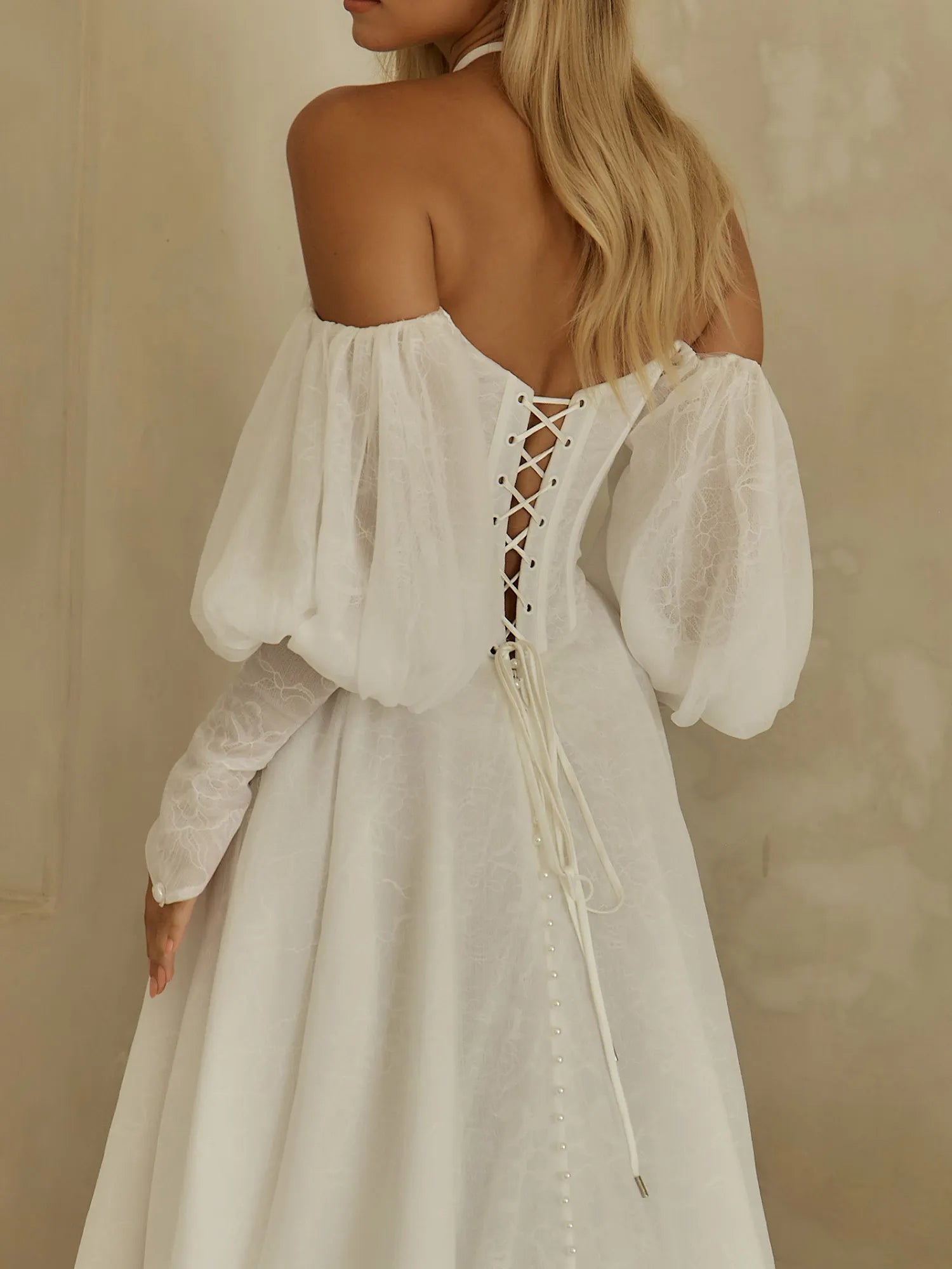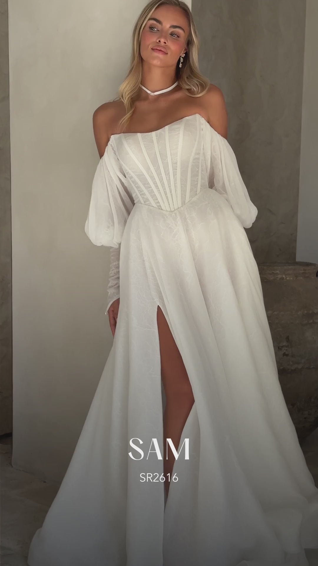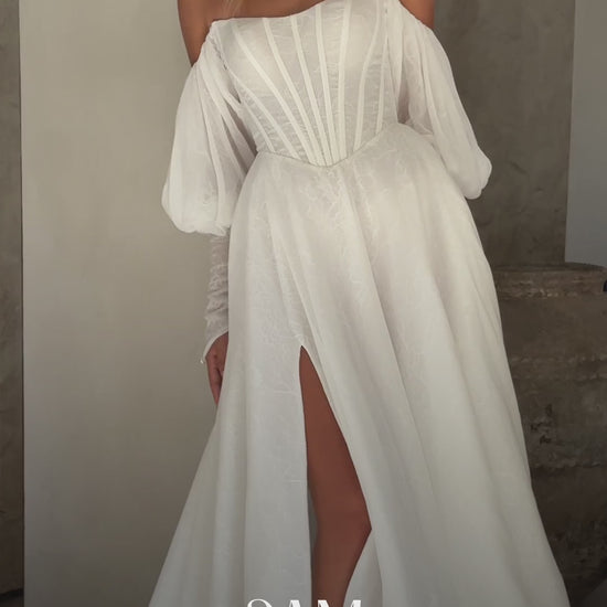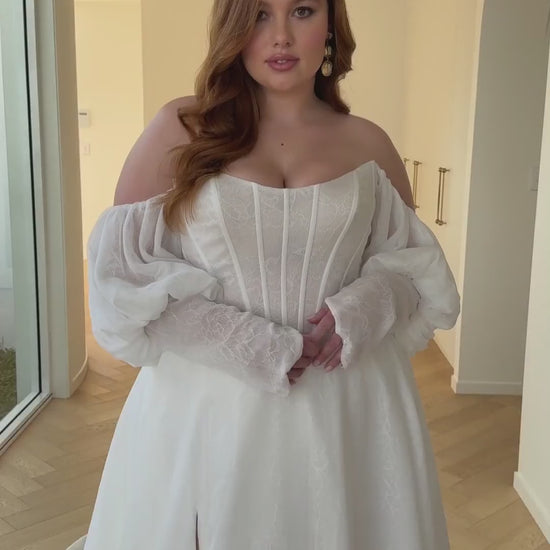 BASQUE WAIST CHIFFON LAYERED WITH CHANTILLY LACE A-LINE GOWN WITH SCOOP NECKLINE AND OFF-SHOULDER BLOUSON SLEEVES WITH FOREARM CUFFS.