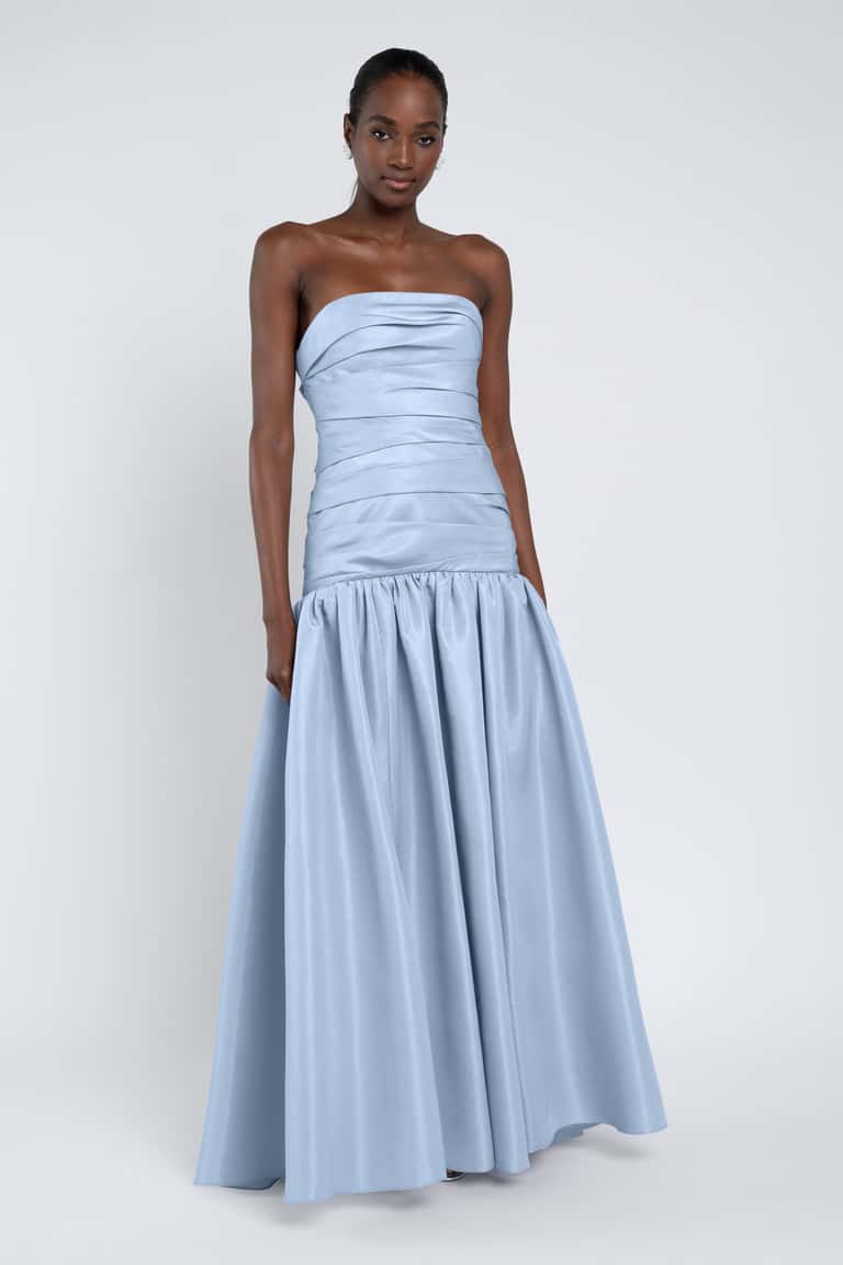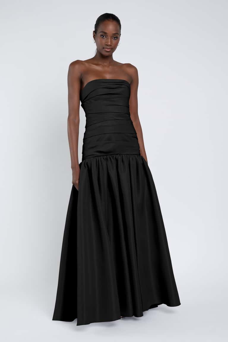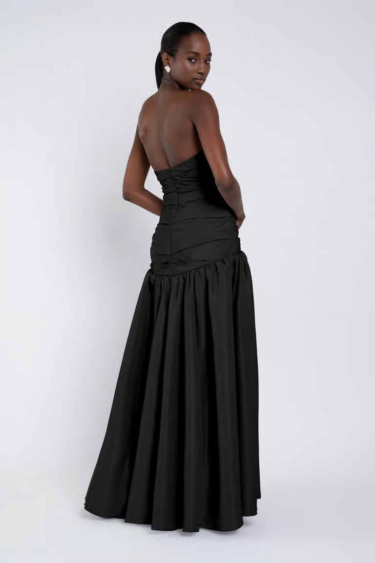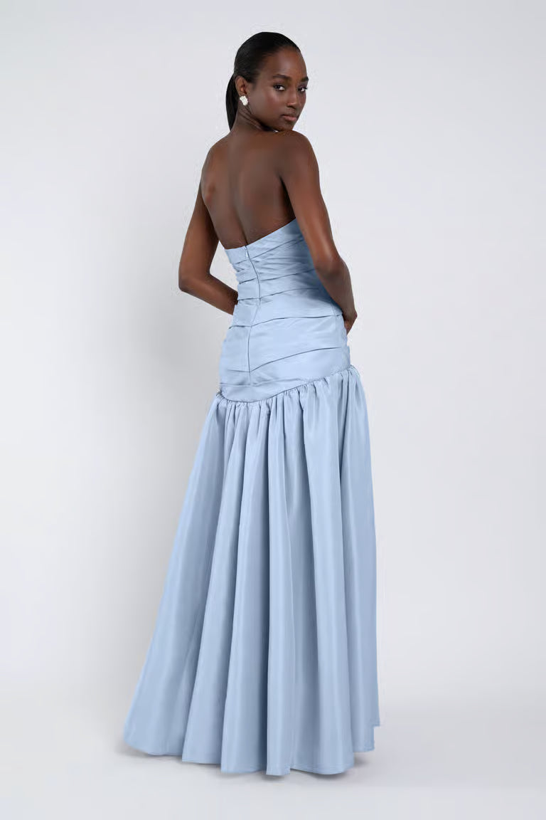 The Sarah dress, cut in our new lightweight taffeta, features a dramatic mermaid silhouette and a structured bodice adorned with elegant pleat detailing.