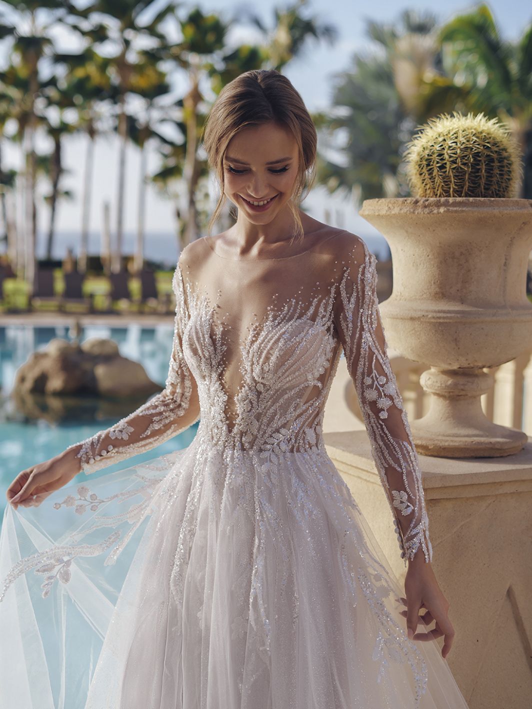 This wedding dress, with its A-line shape and patterned lace, is the epitome of elegance. Its sheer long sleeves are adorned with a leaf-patterned lace that adds a touch of magic and charm. The lace top nicely accentuates the body's shape, and the skirt, made from sparkling tulle layered over soft tulle, flows out beautifully to give it a romantic flair. This gown is designed to leave an unforgettable mark on your special day.