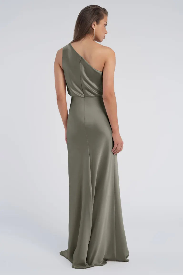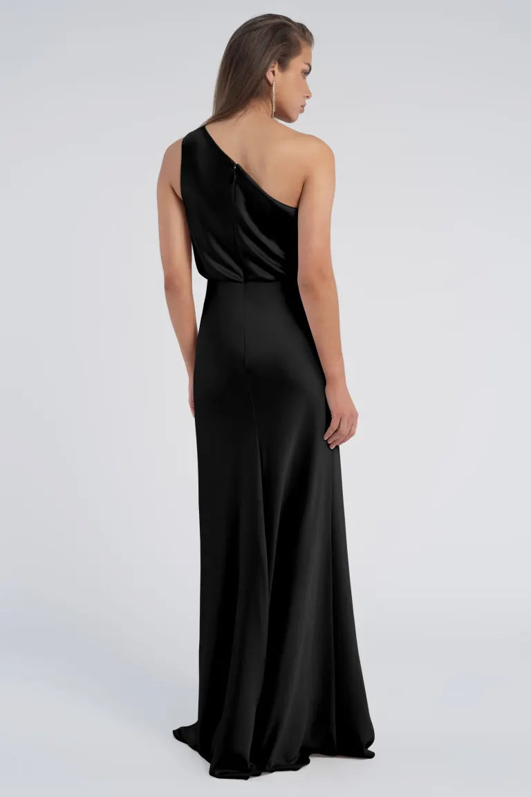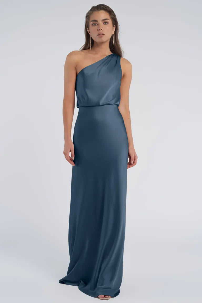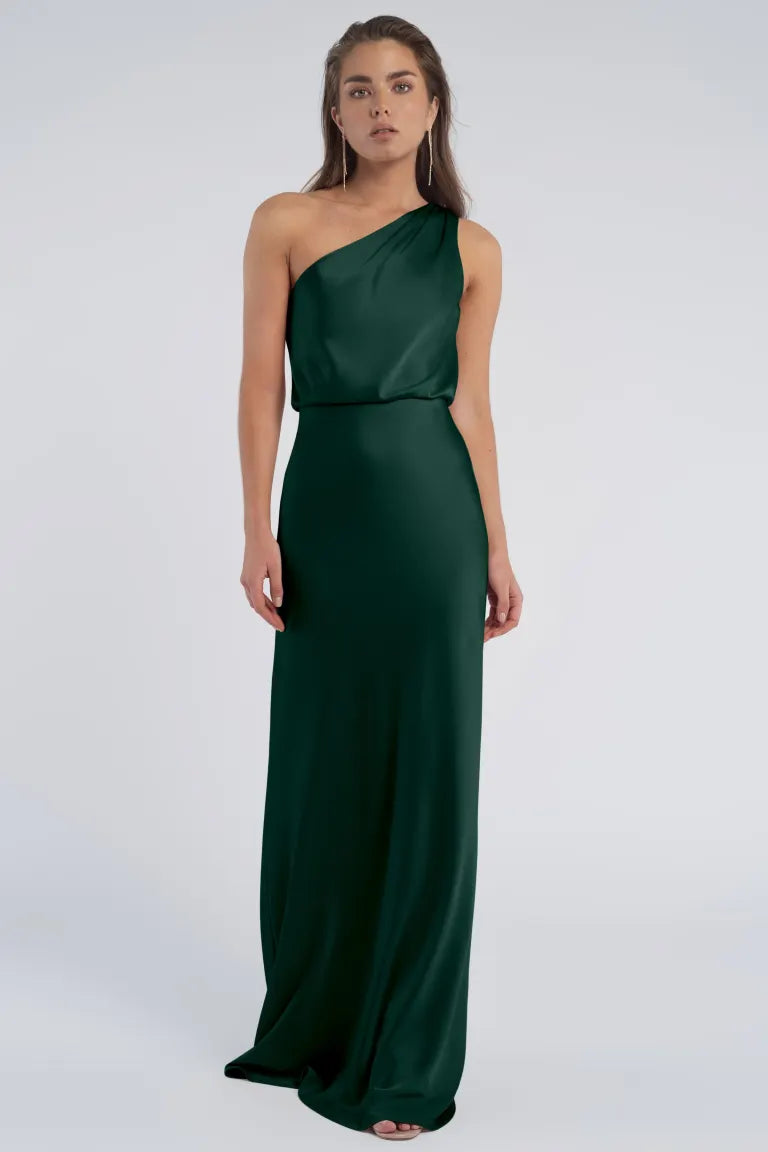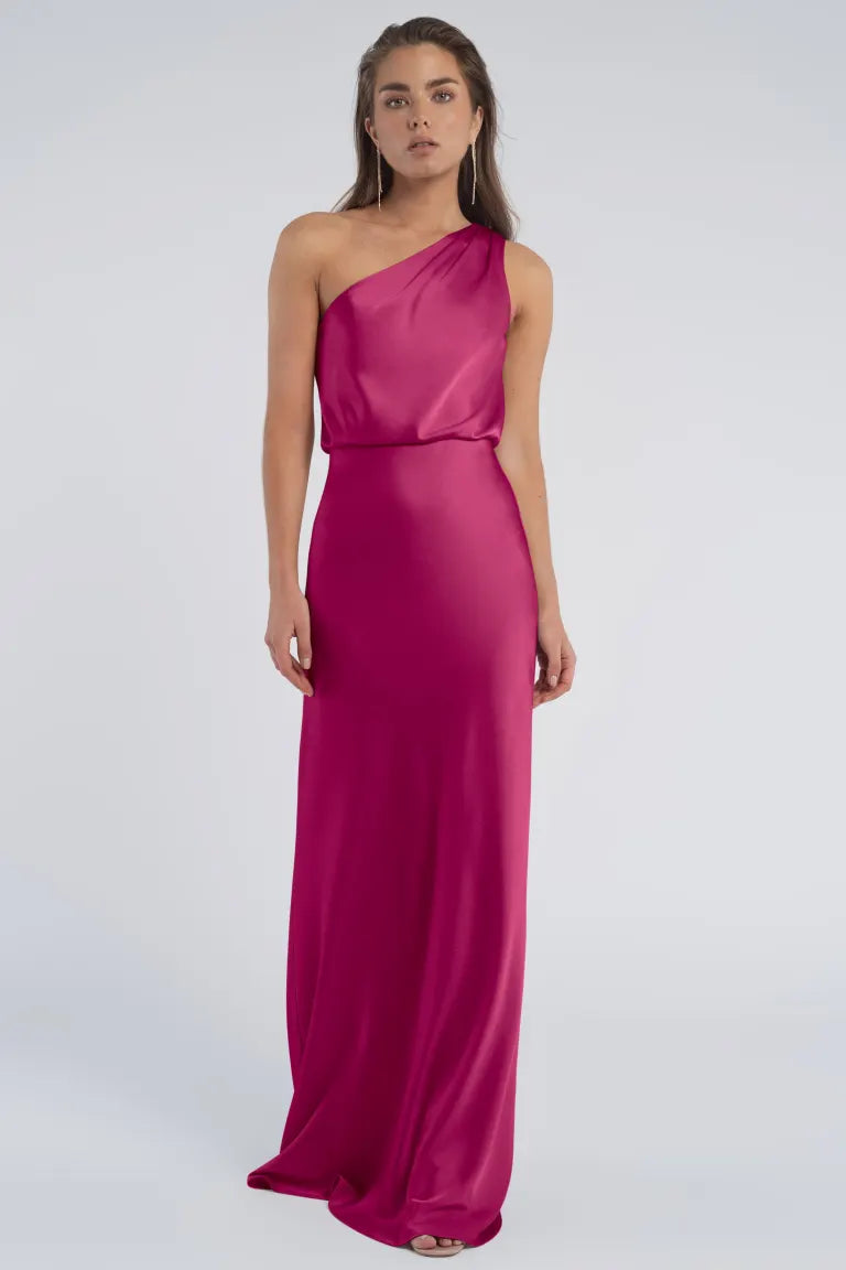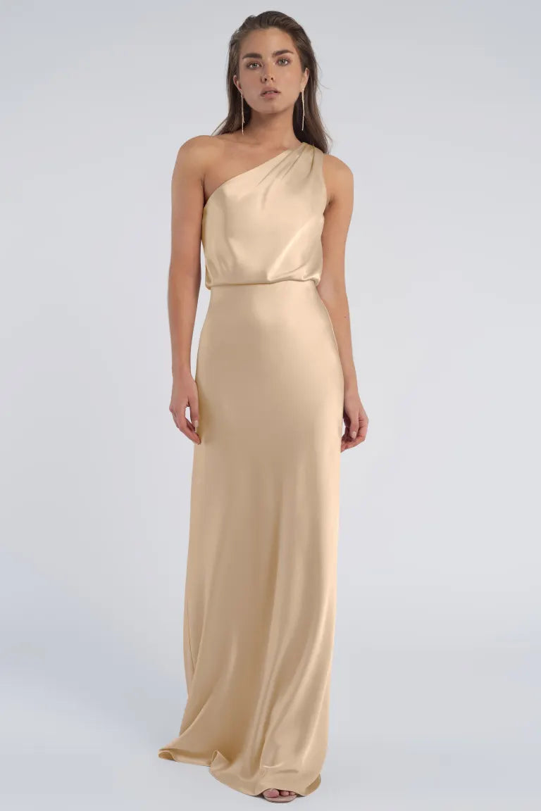 The Sterling dress, cut in our lustrous luxe satin fabric, takes inspiration from old Hollywood. Featuring an elegant one shoulder neckline with a pleated detail and a flattering blouson waist, her slinky bias cut skirt flatters your every curve.