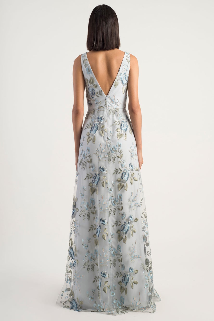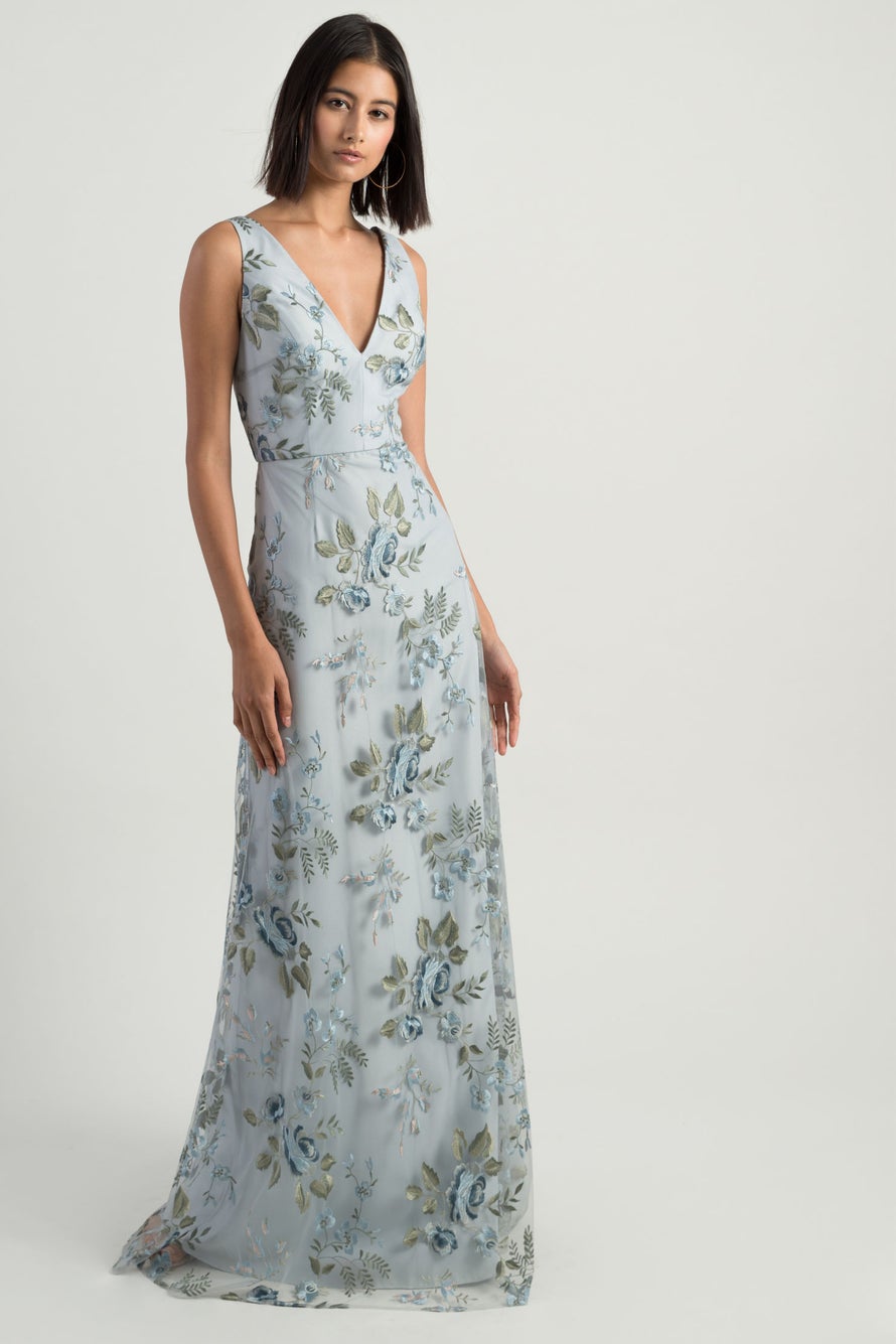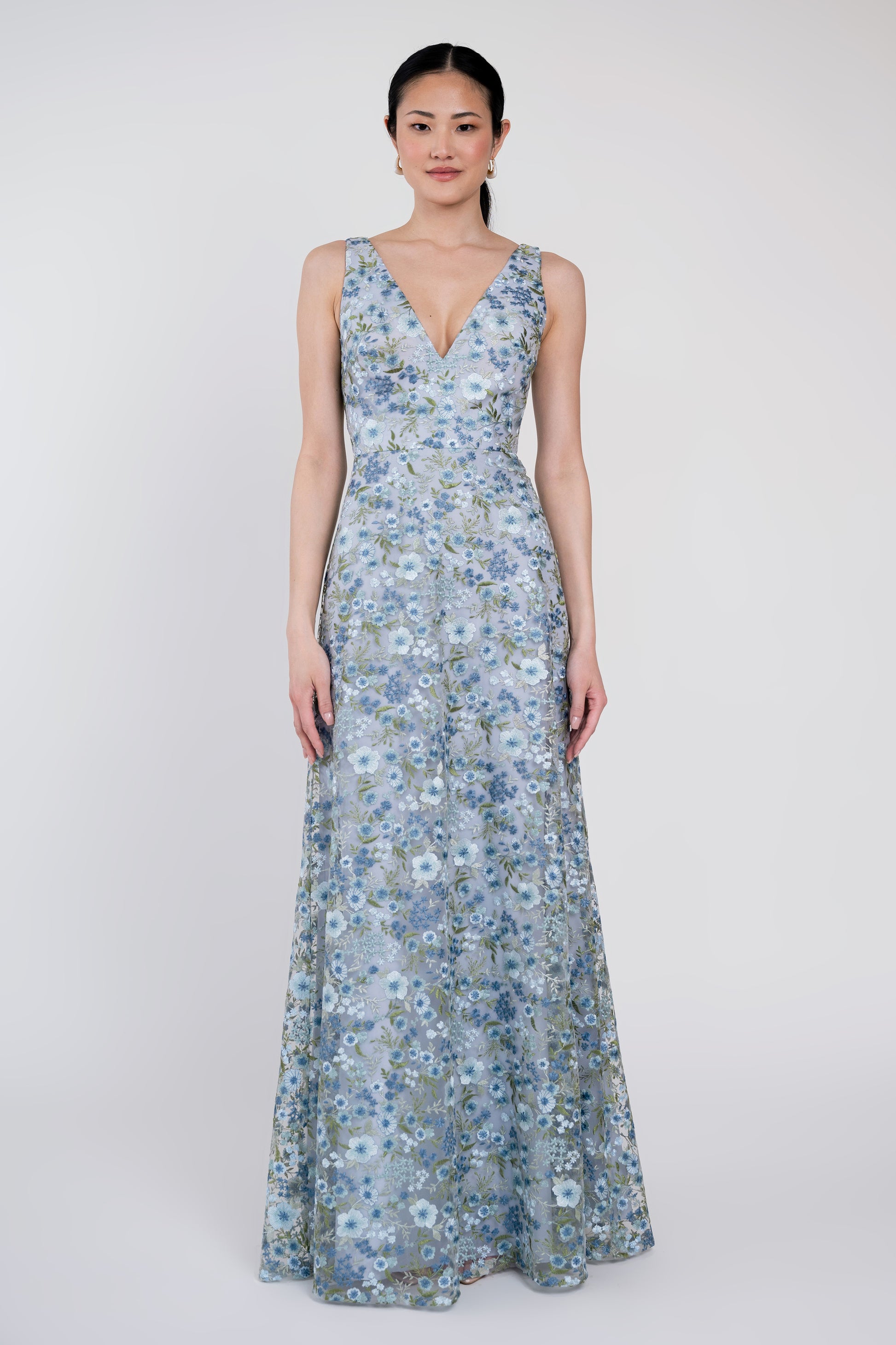 The Tatum V-neck dress for bridesmaids comes with broad straps and a snug top that flows into a sleek, gently flared skirt. Made from our detailed floral lace, this dress has a timeless, romantic feel.