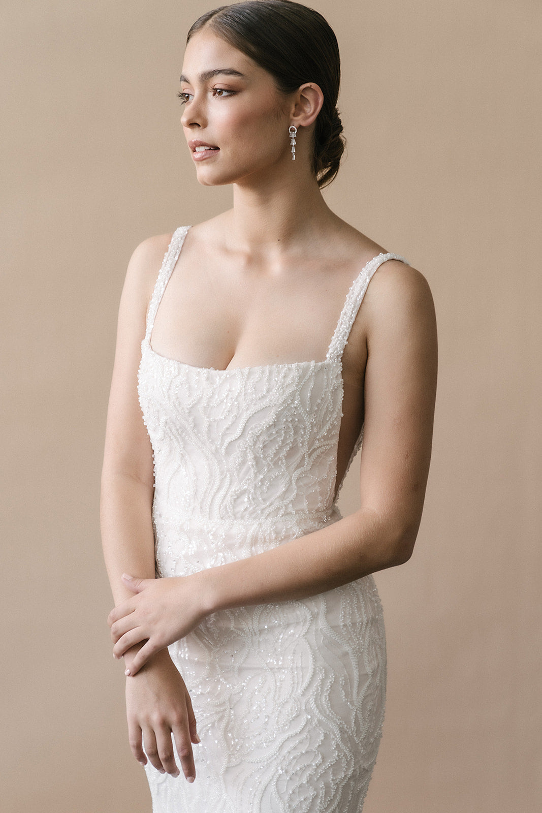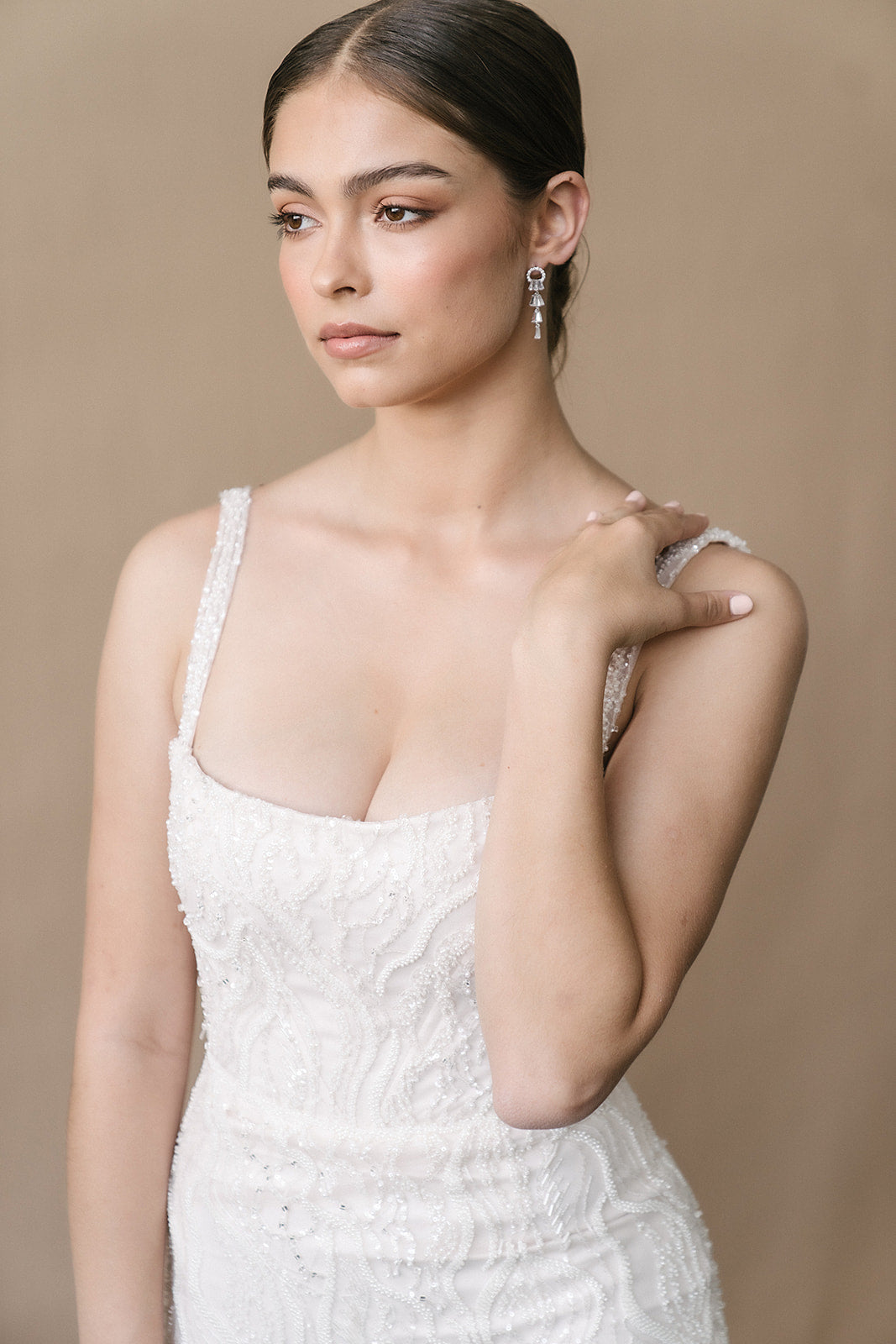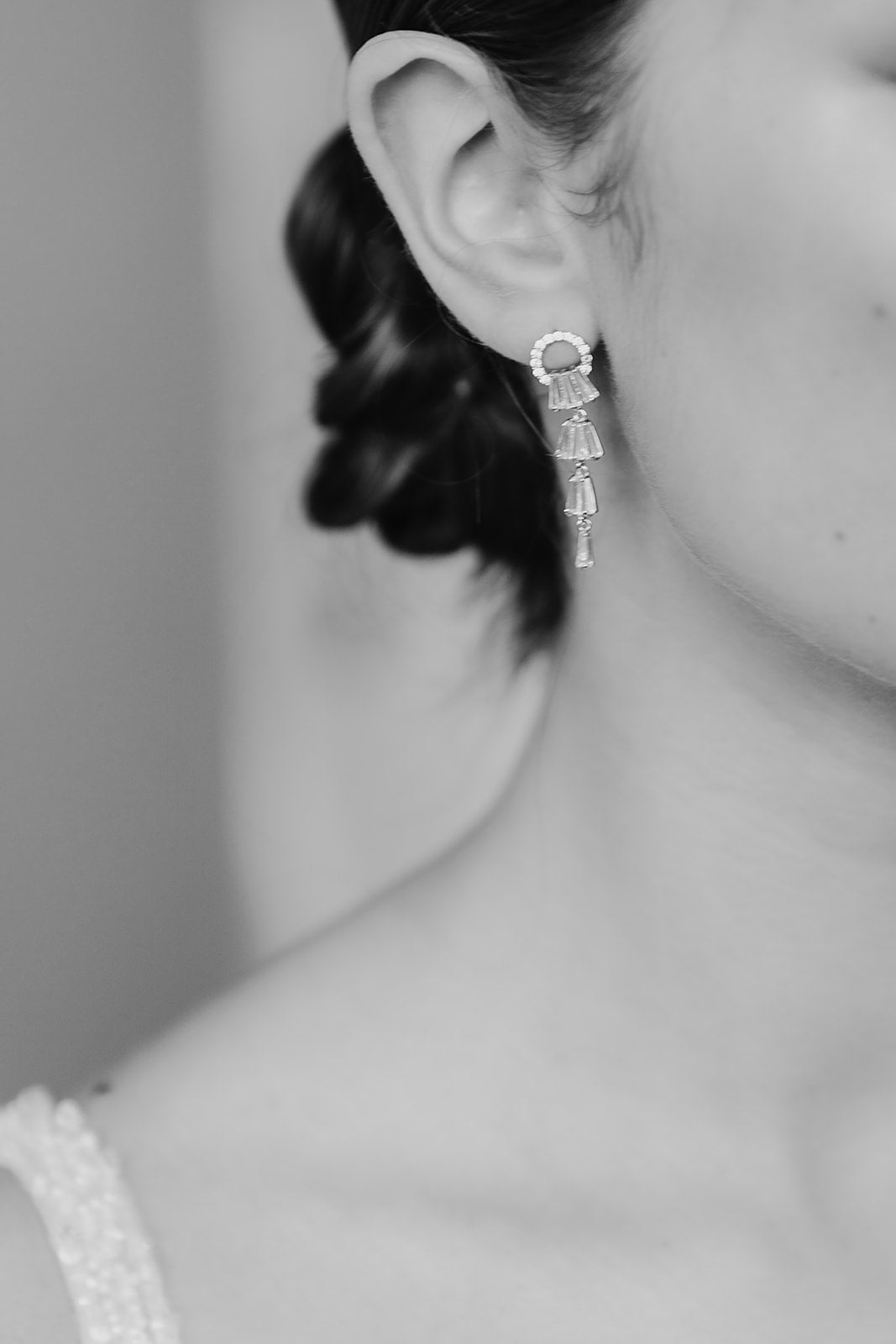 Romantic and modern, Wyn is made up of layers of a shimmering chandelier body. Made with 18K white gold and detailed artisanal skills, Wynn is the epitome of natural and effortlessness in bridal dressing.